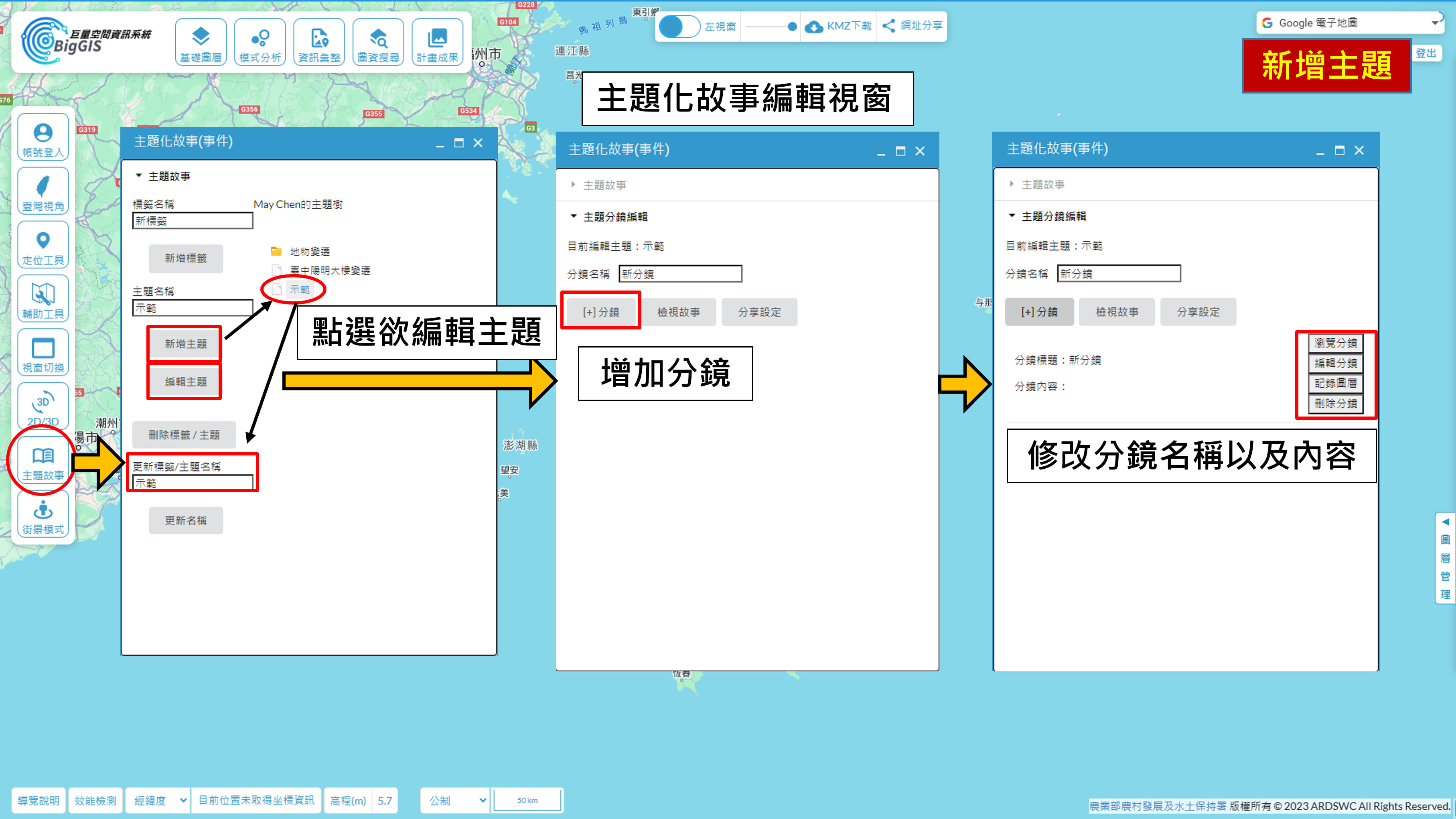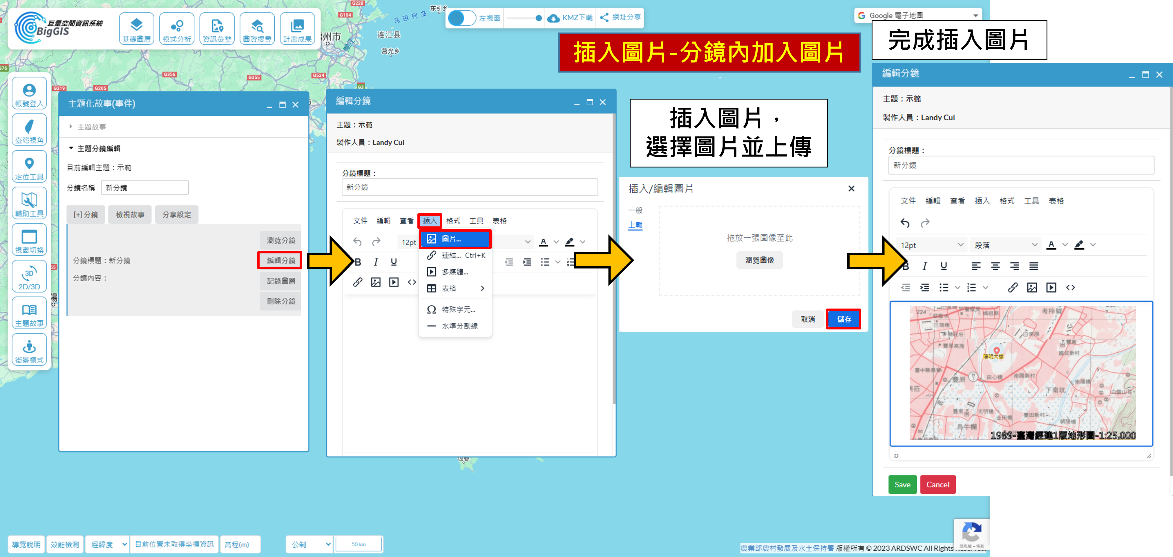 👉為強化主題化故事編輯效能,BigGIS 圖台 > 主題故事 模組中「插入圖片」功能已完成更新,使用者可直接於分鏡畫面上傳圖片,操作更加直覺,內容製作更具效率!