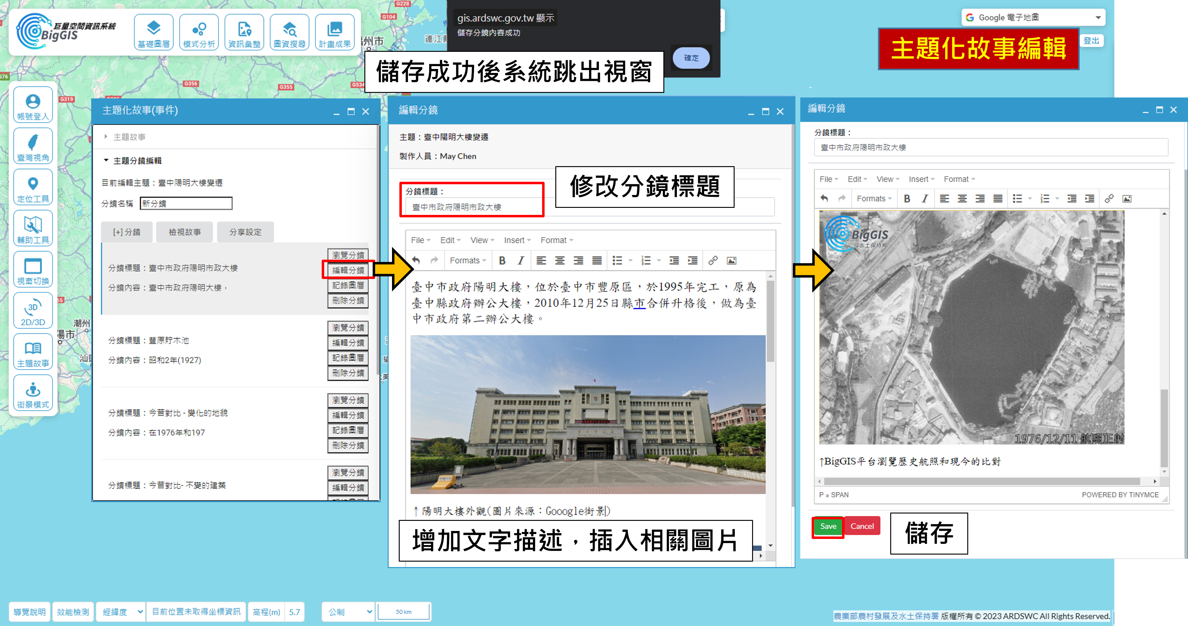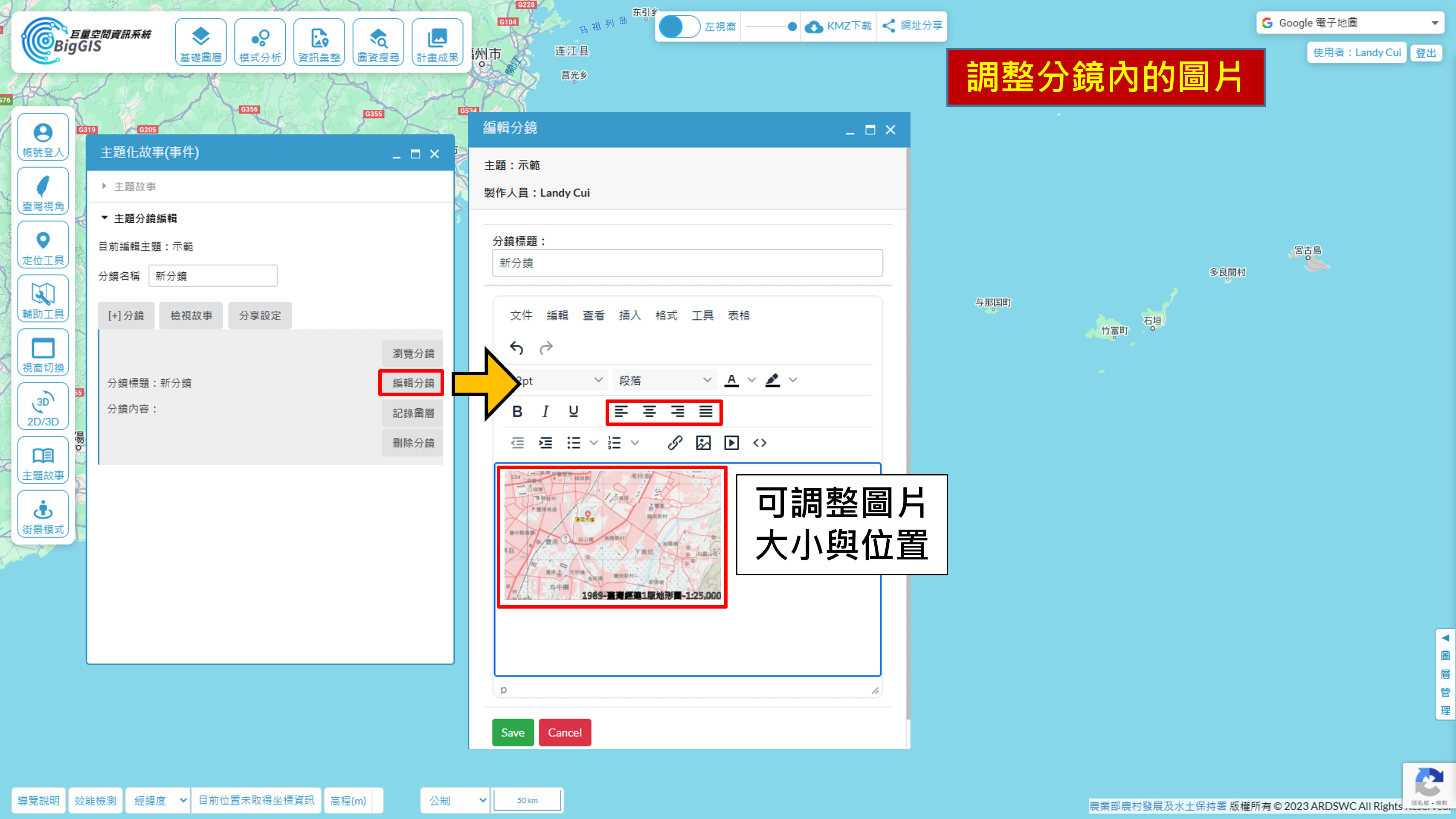 👉本年度針對 BigGIS 圖台中的主題故事功能進行優化,新增支援「直接上傳圖片」功能,使用者可選擇電腦的圖片後,直接上傳至編輯器。此項更新讓主題故事內容撰寫更加簡便與快速,提升使用體驗。