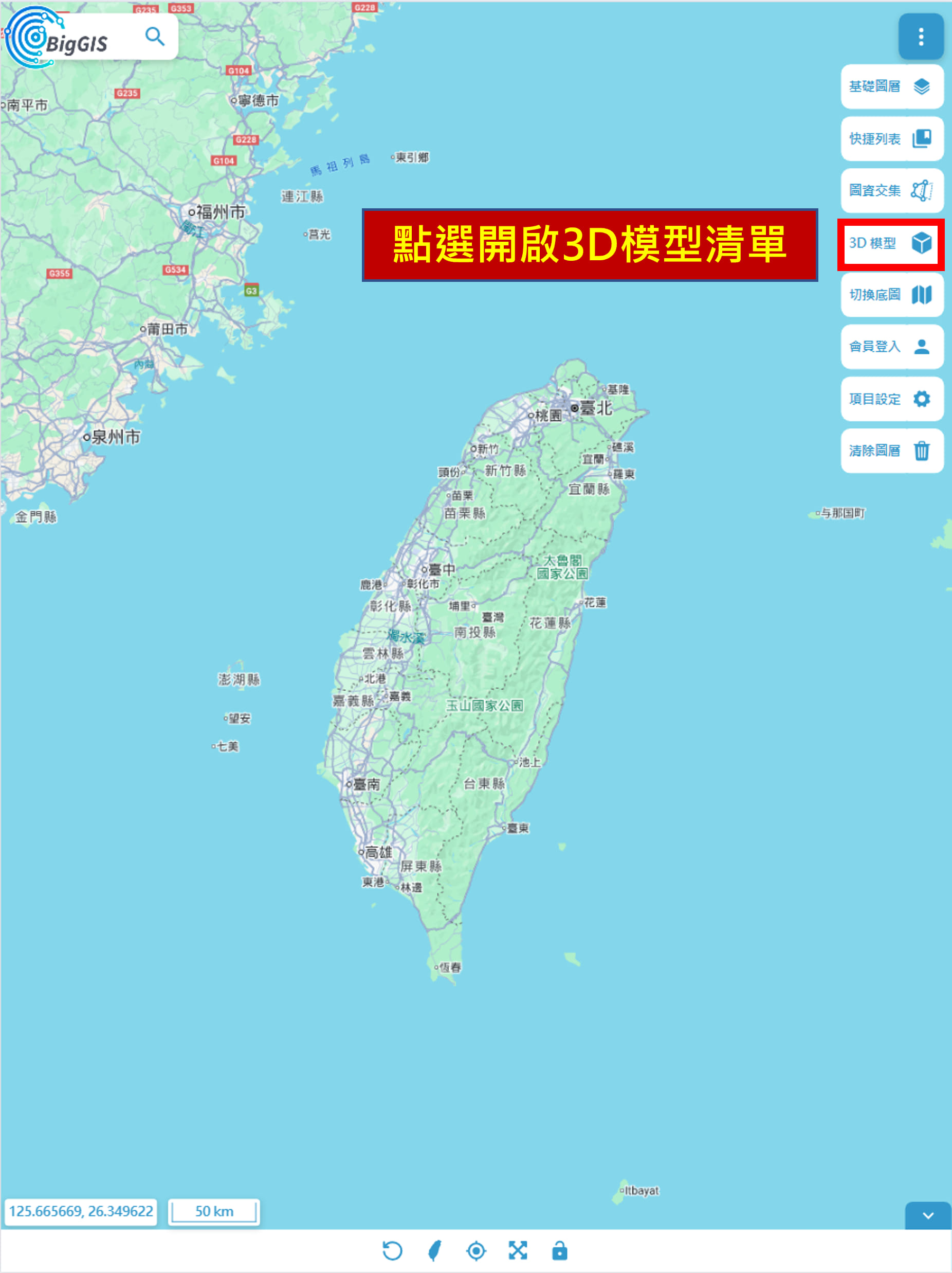 【圖1】 BigGIS Lite 介面中點選右側「3D模型」按鈕開啟清單
