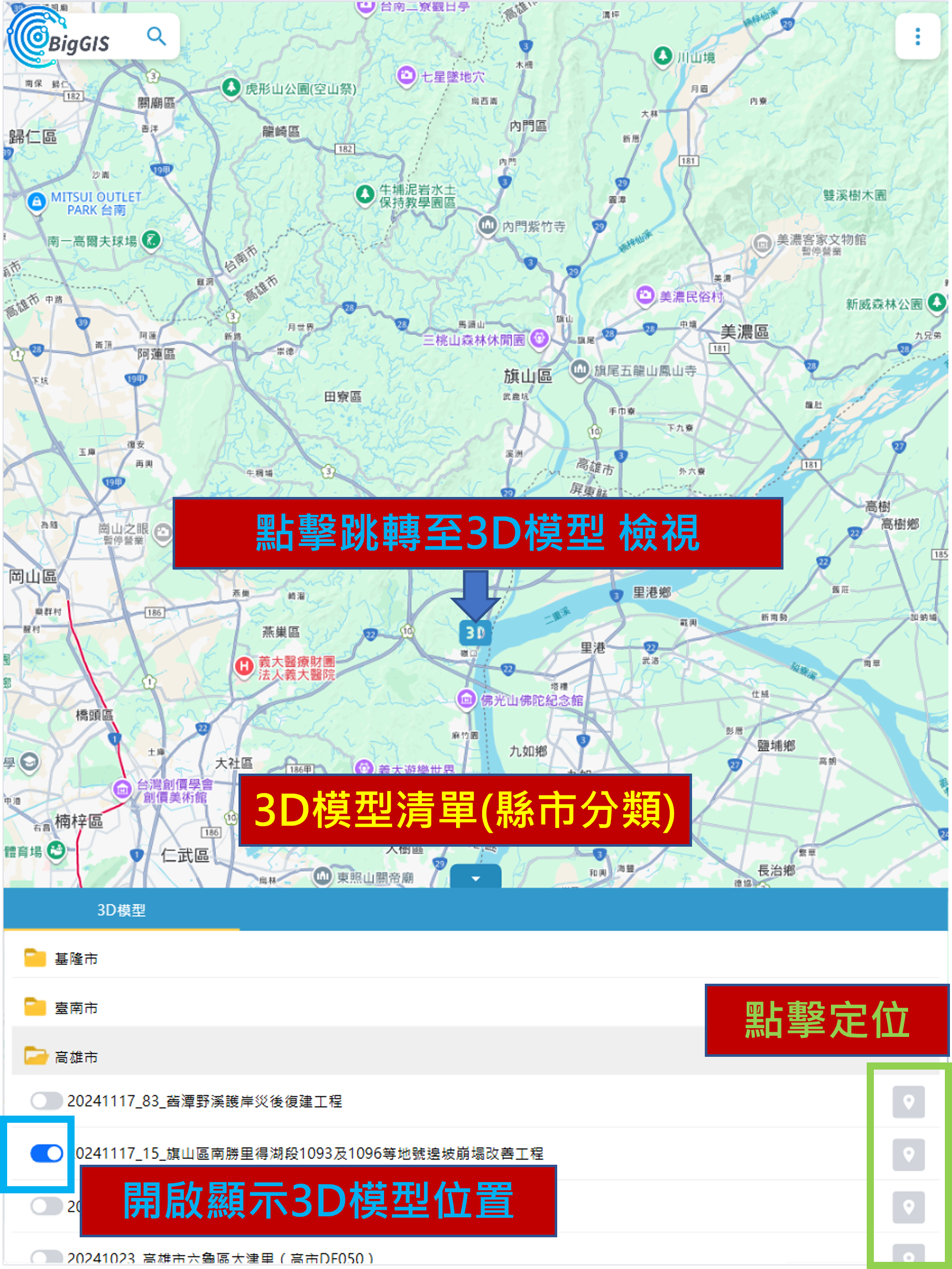 👉 3D模型清單分類與定位:點選「3D模型」按鈕即可開啟縣市分類清單,點擊模型項目可快速定位至對應區域,協助使用者即時掌握工程分布位置。