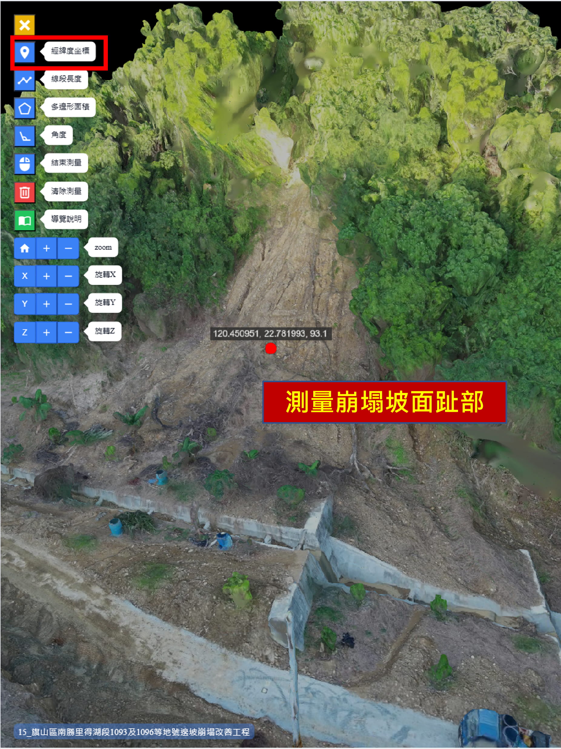 【圖4】使用「座標量測」功能測定崩塌坡面趾部起點位置