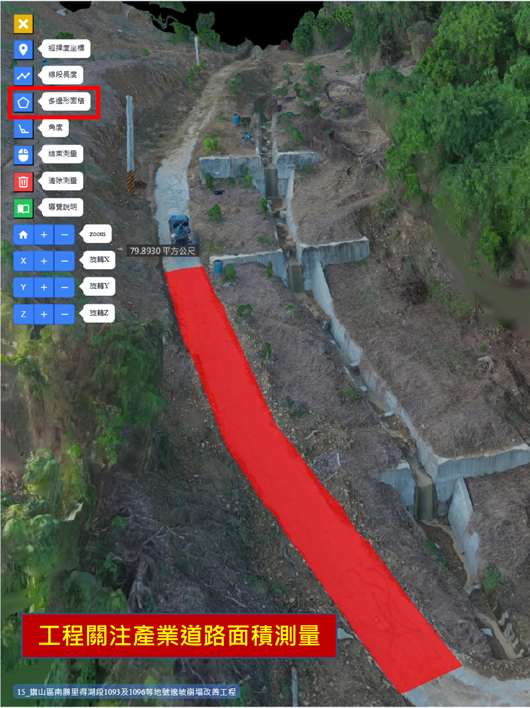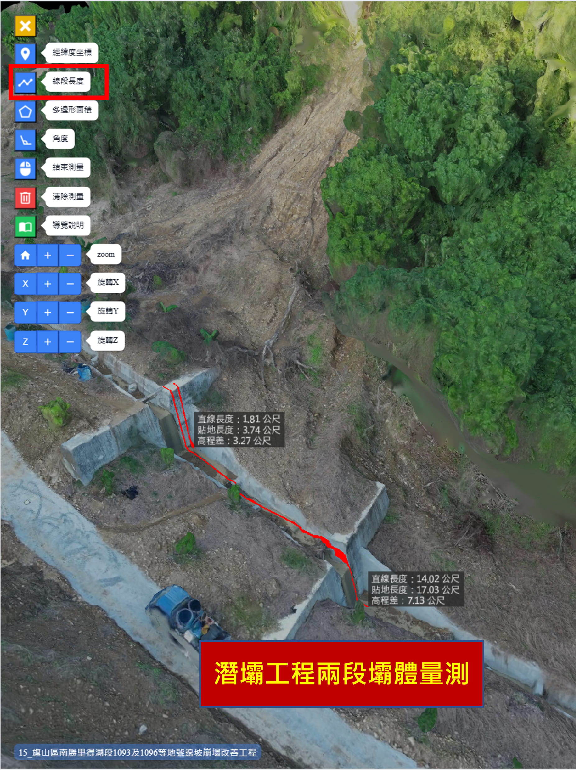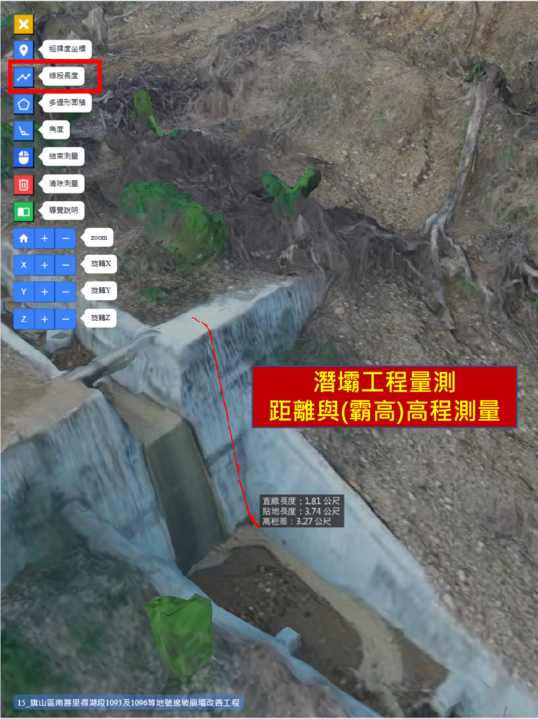 👉多元量測工具整合:支援座標量測、線段長度、高程差與面積計算,可應用於崩塌坡面監測、潛壩結構量測與道路工程檢視等多樣場景。