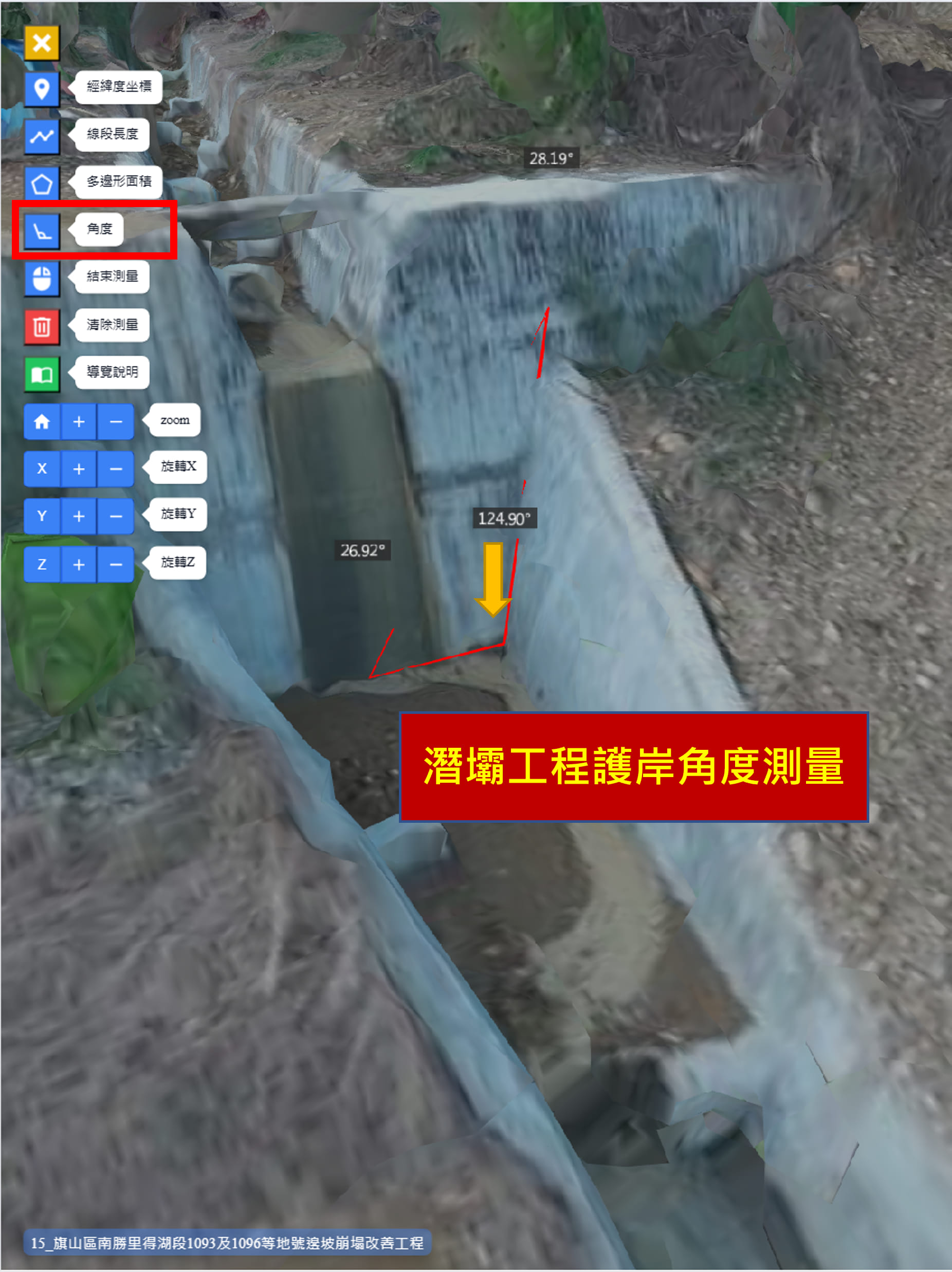 👉特定物件資訊取得:透過座標與線段量測功能,可精確標定坡面崩塌點位置、測定潛壩護岸角度及高程差,輔助現地結構分析。