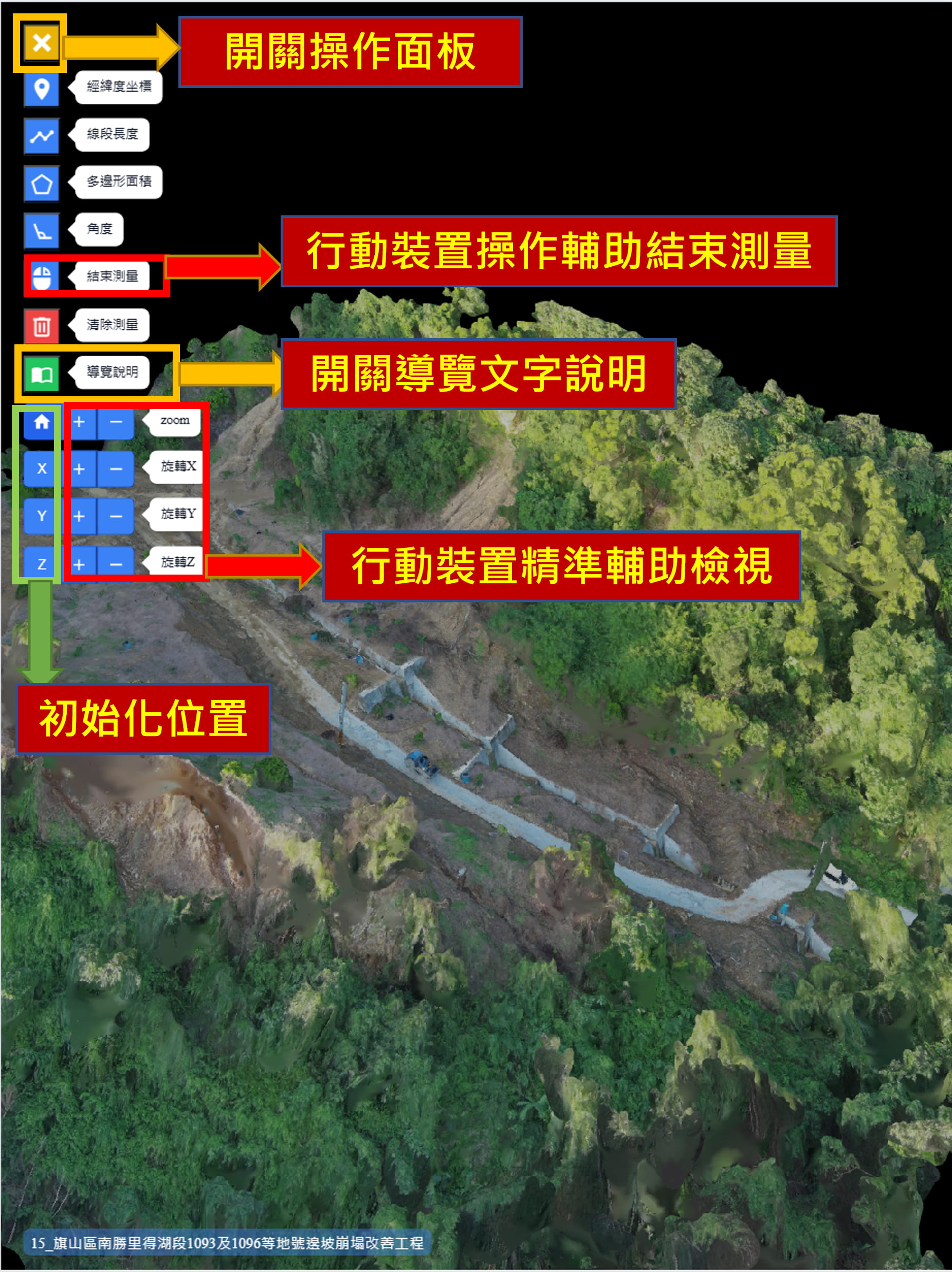 👉行動端輔助操作介面:內建旋轉、縮放、初始化等操作面板,搭配「導覽說明」文字提示,讓使用者在行動裝置上也能流暢進行3D檢視與量測操作。