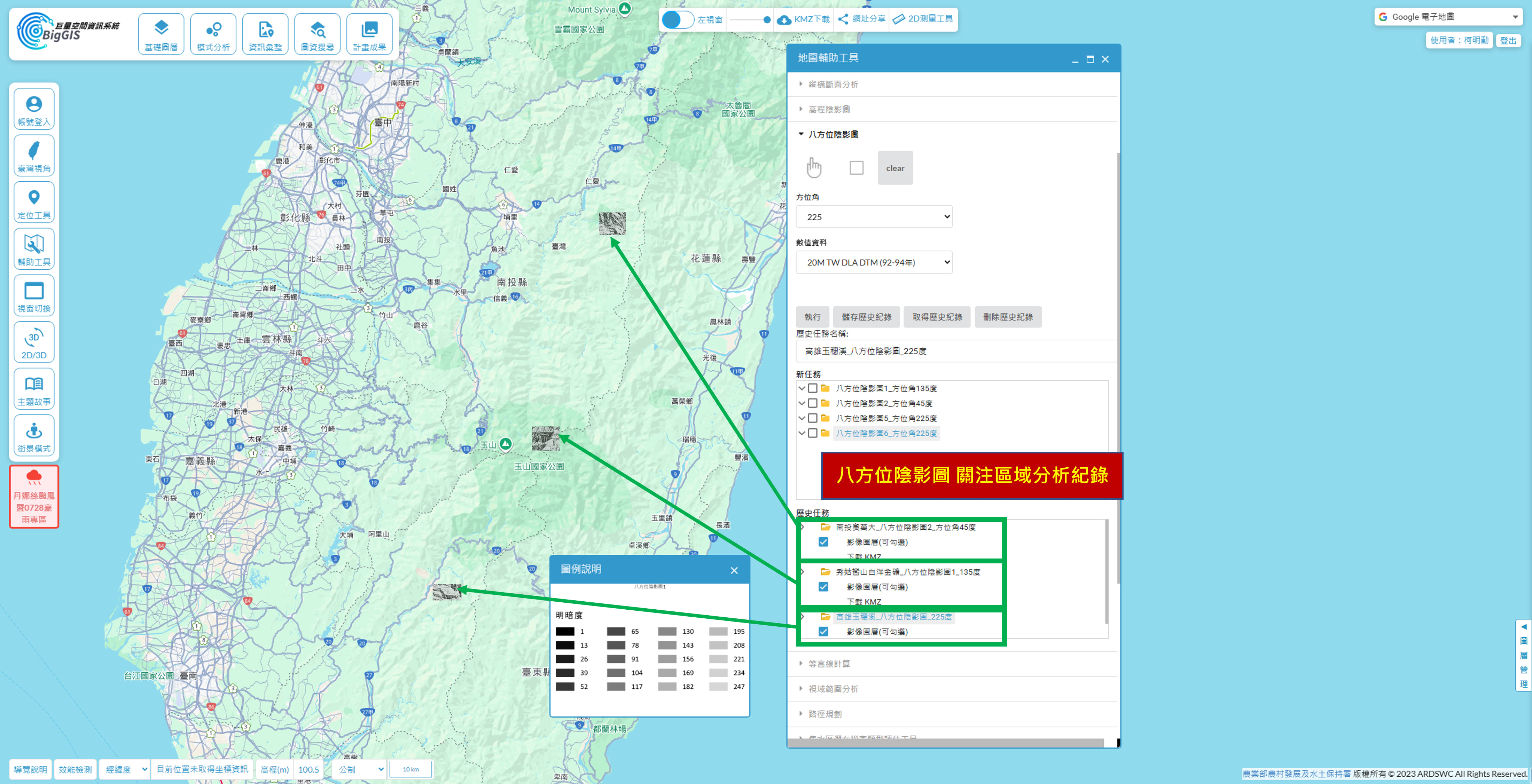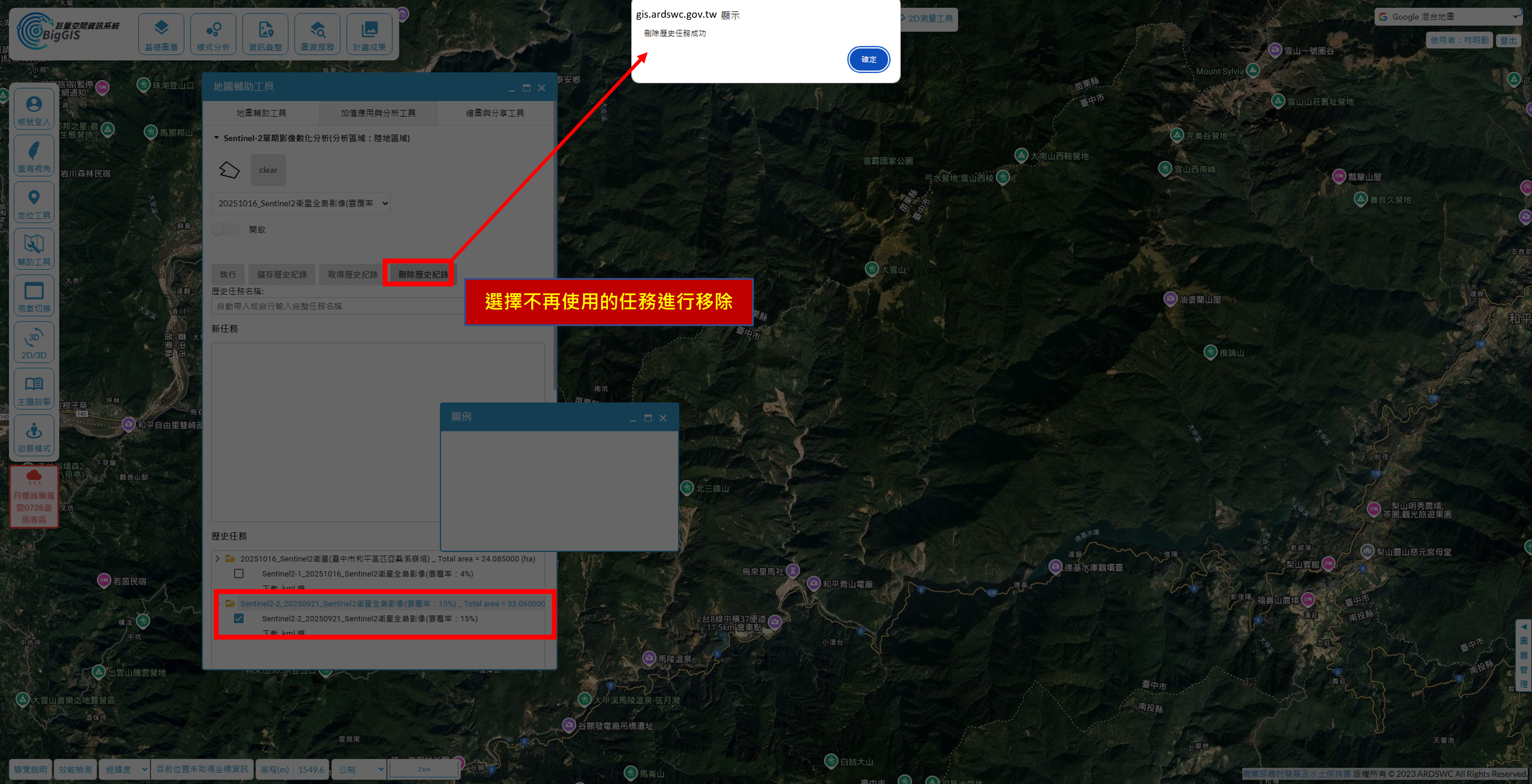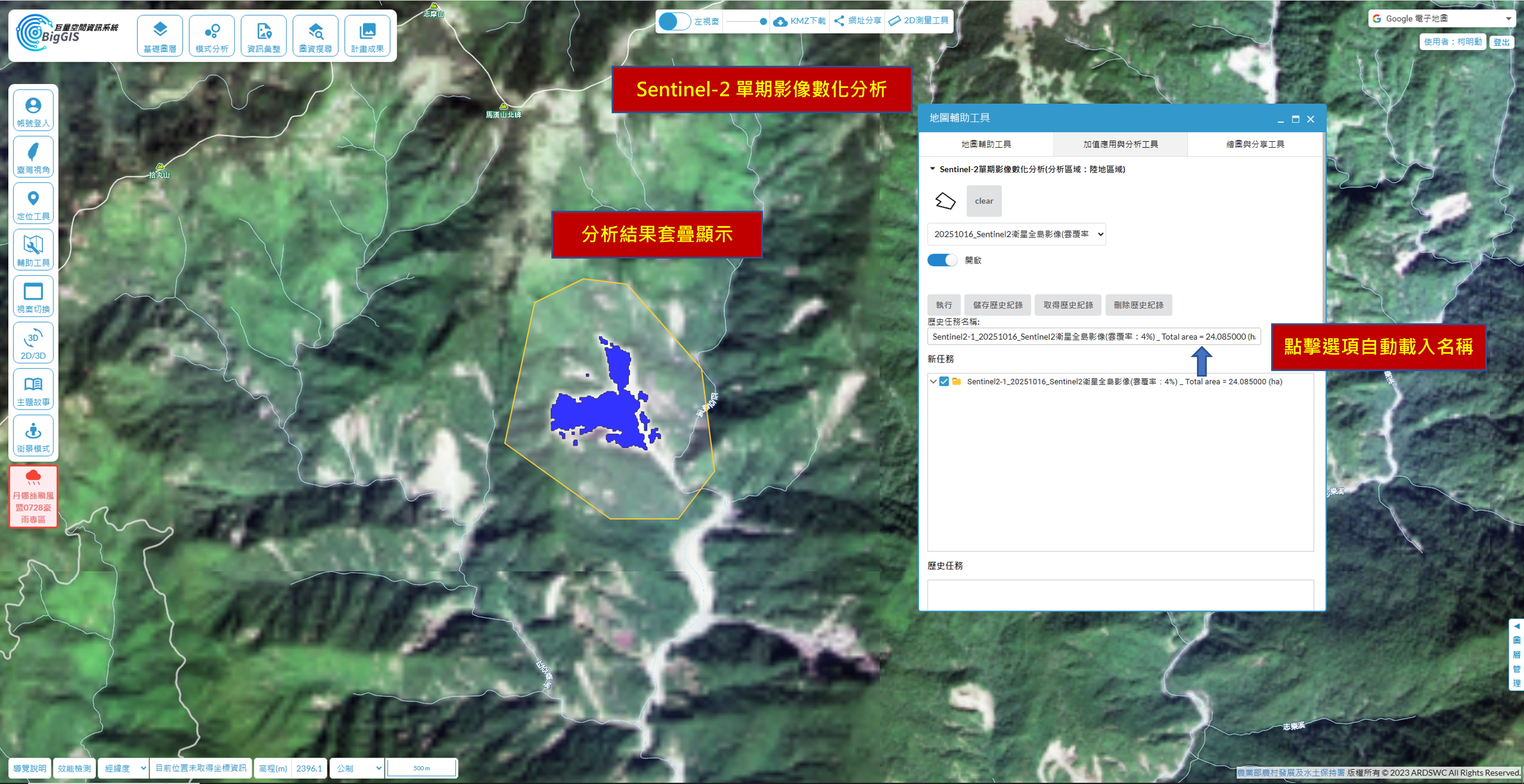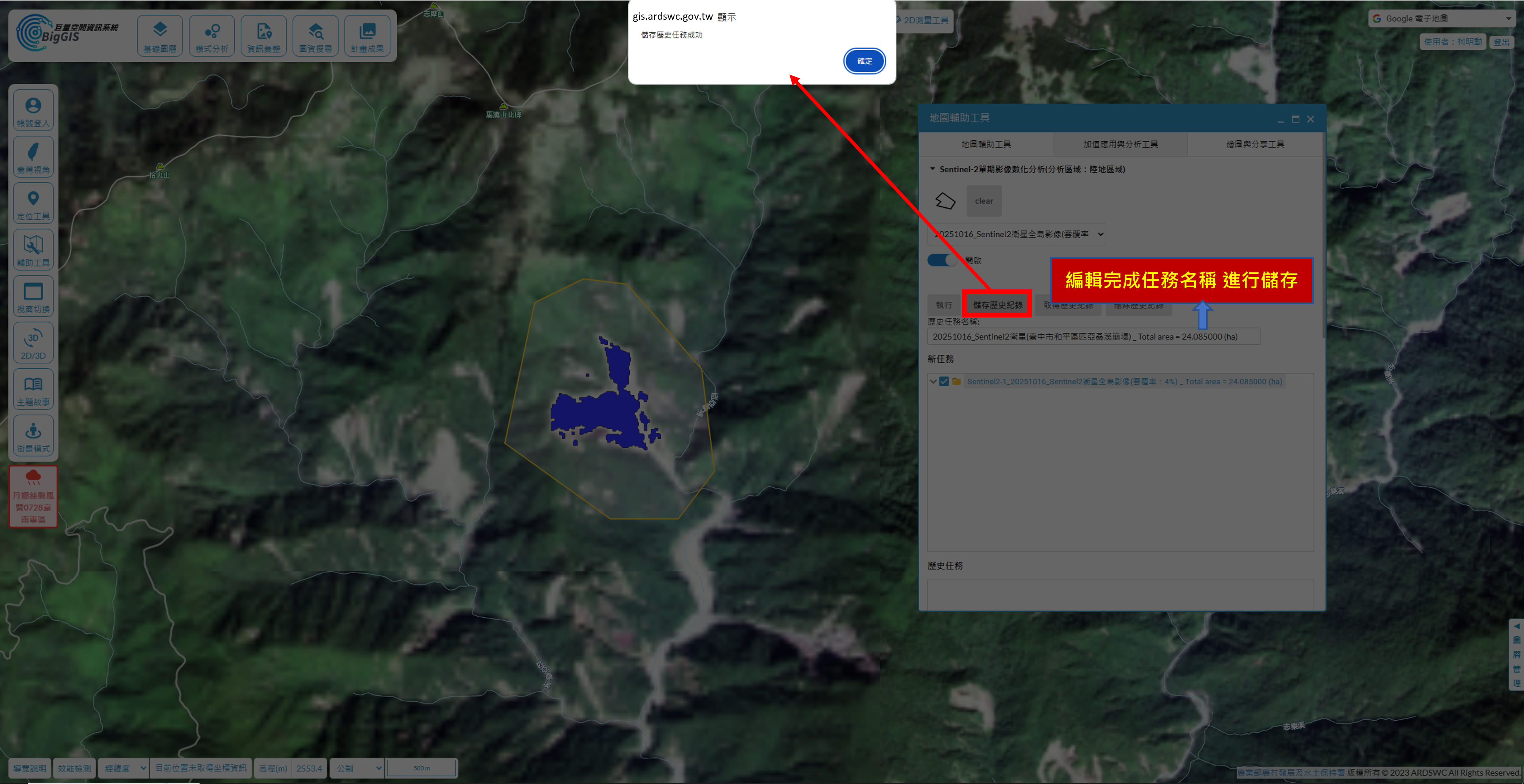 👉分析紀錄自動儲存:執行 Sentinel-2 單期影像數化分析、八方位陰影分析 等12項功能後,透過系統可自訂建立分析任務紀錄。