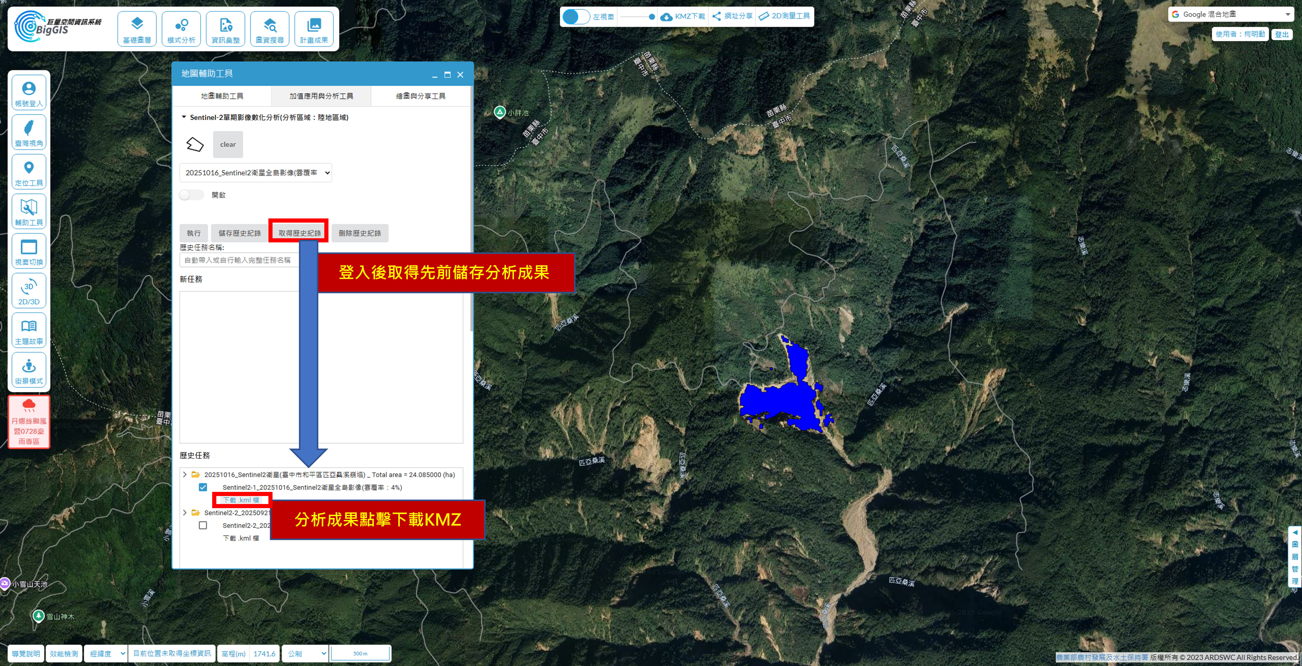 👉歷史成果管理:登入後可查看歷史分析紀錄,並支援下載分析成果(KMZ 格式)或刪除不再使用的任務。