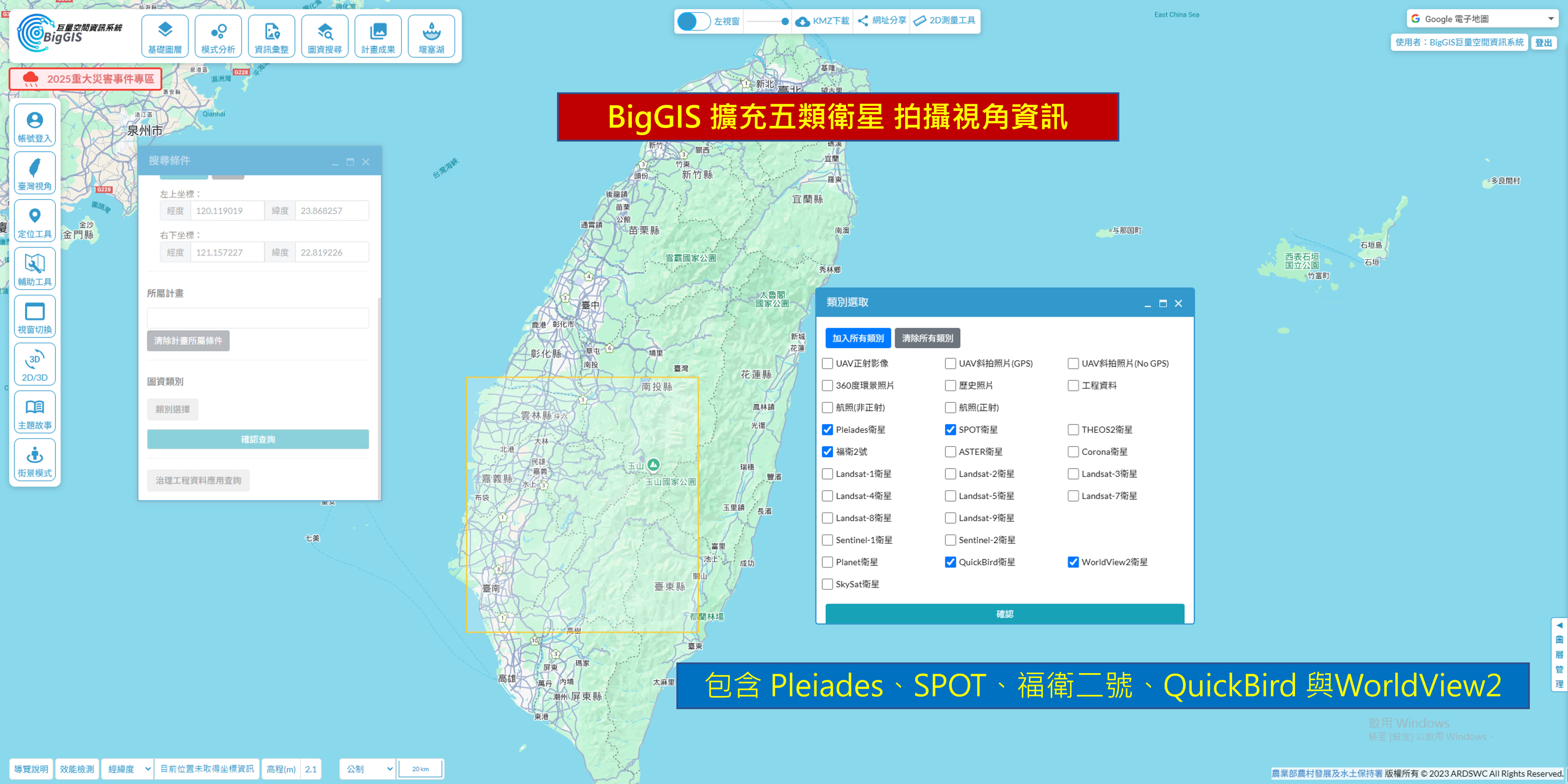 👉擴充五類衛星視角查詢:包含Pleiades、SPOT、福衛二號、QuickBird、WorldView2 等五類影像資料。