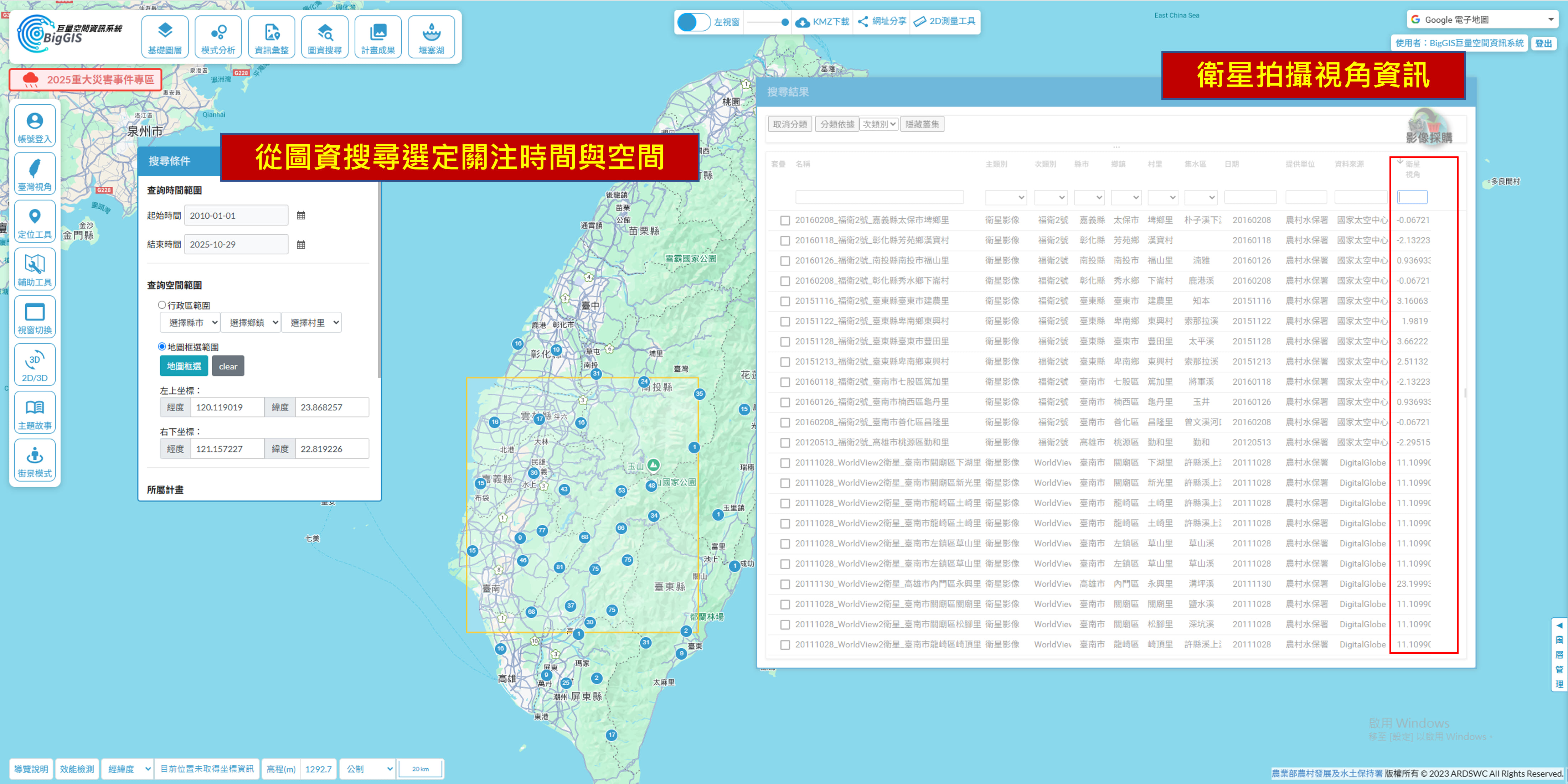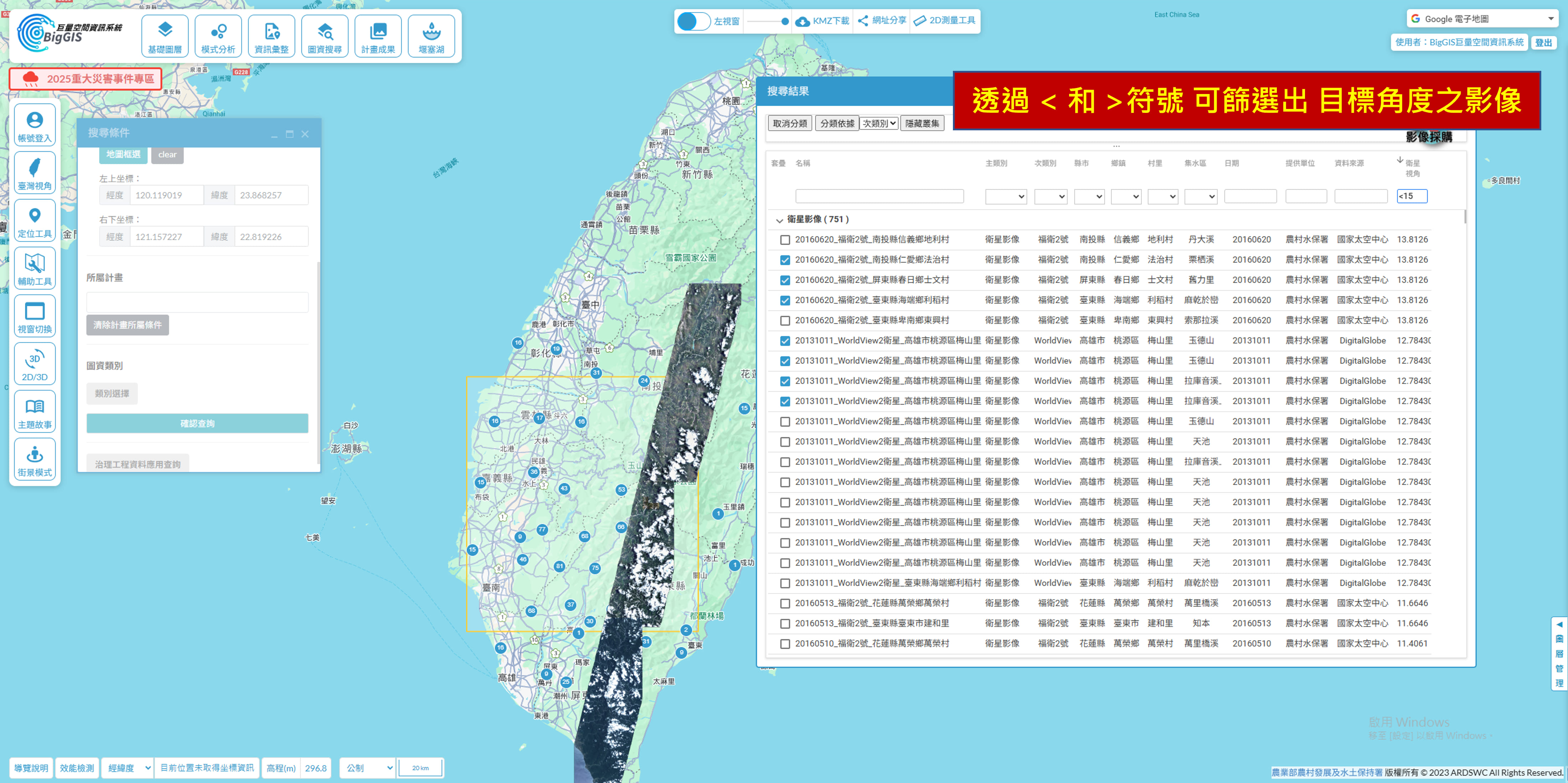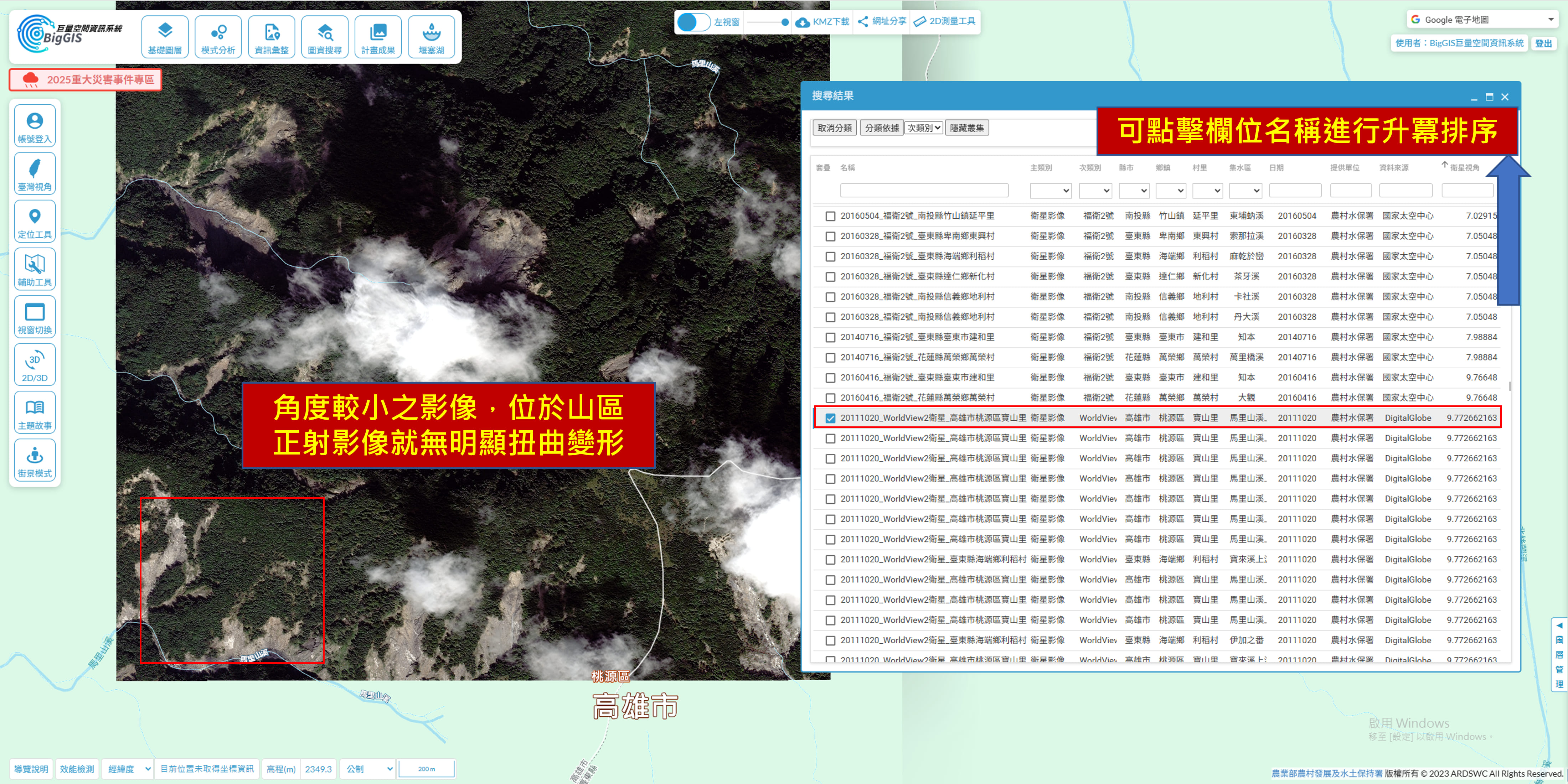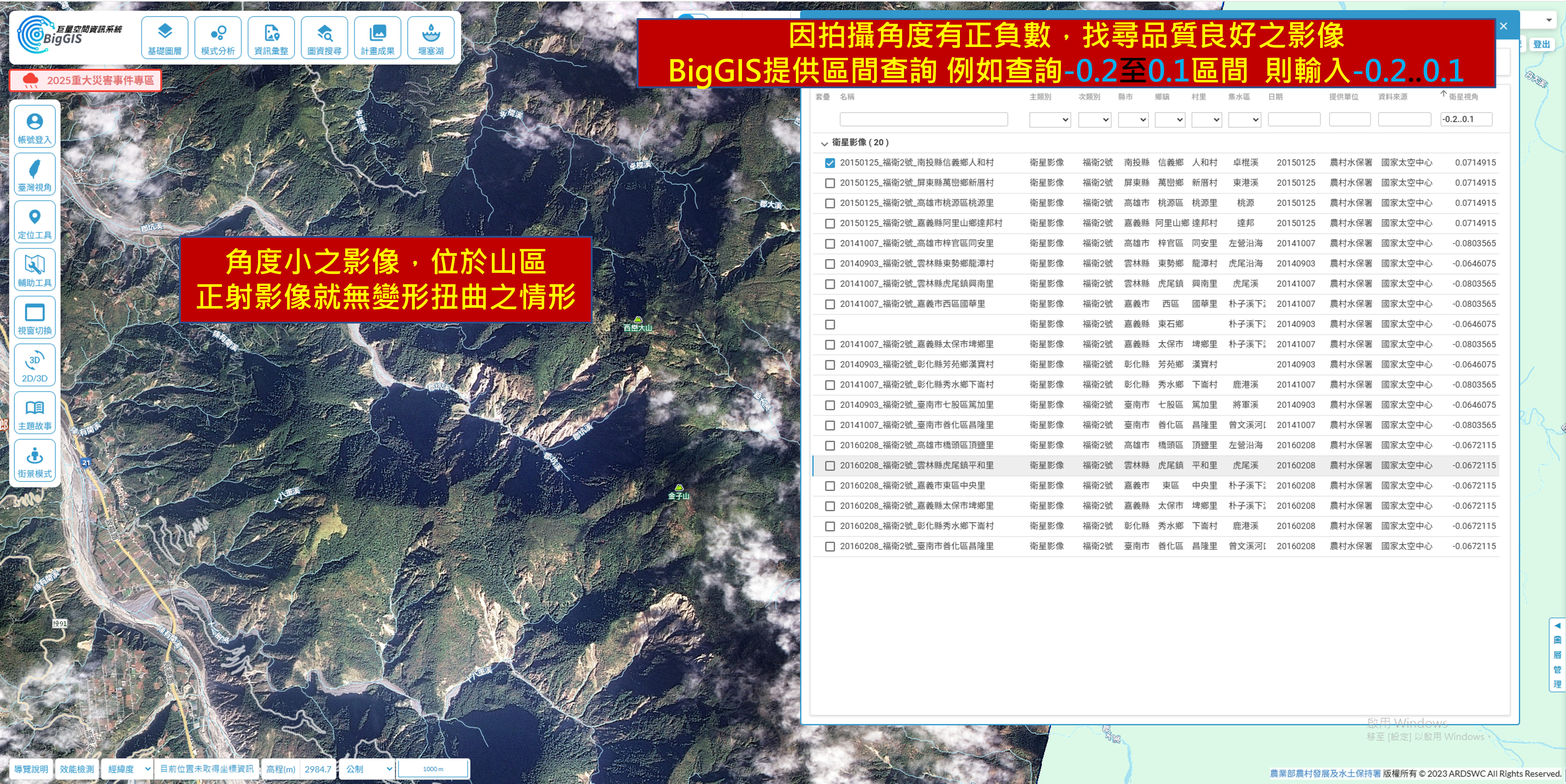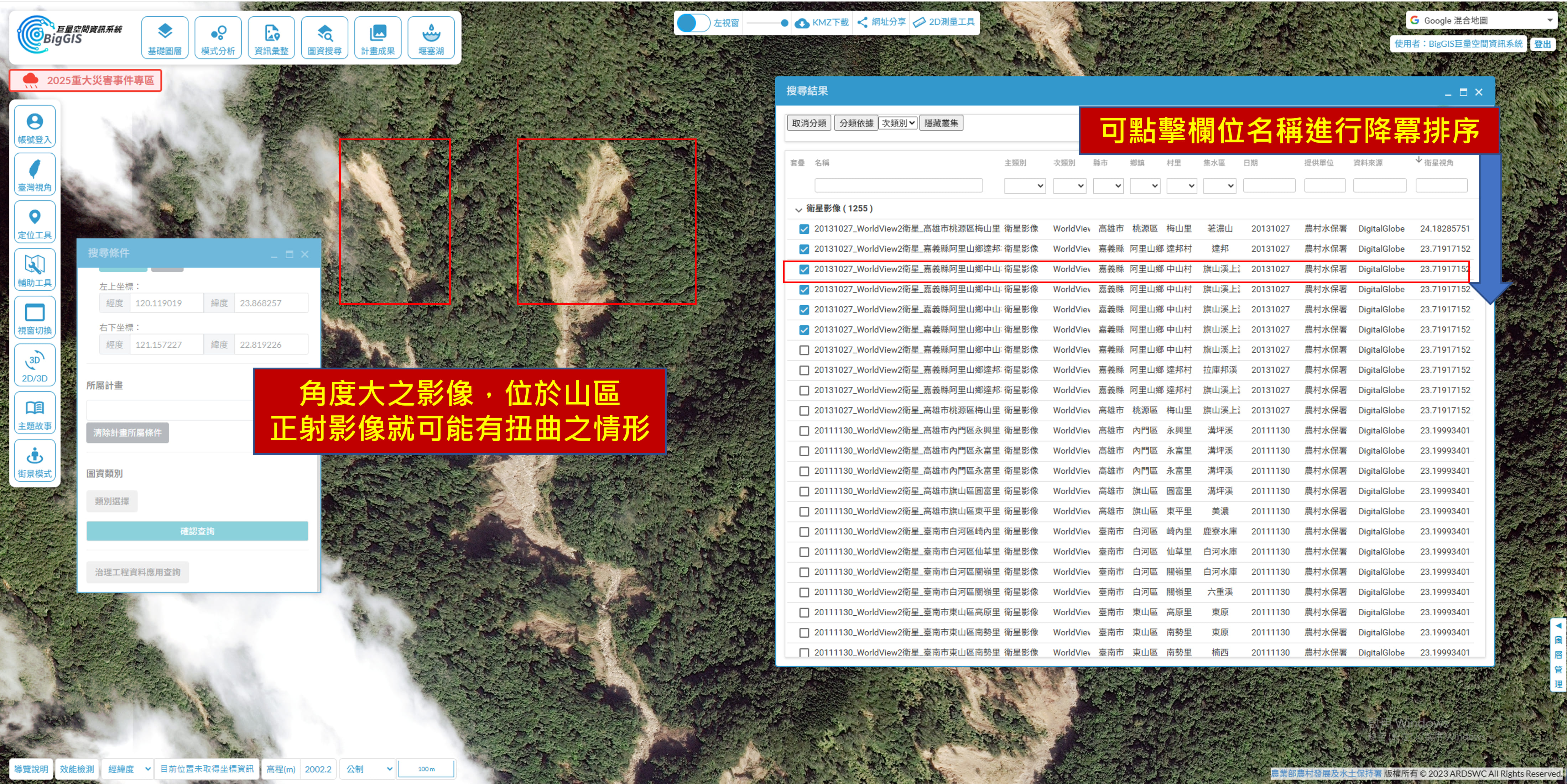 👉 為提升影像查詢品質與判釋準確度,BigGIS 新增「衛星影像拍攝視角資訊」,使用者可快速篩選不同拍攝角度的衛星影像,掌握傾斜程度對地表變形的影響,支援災後影像判釋、地形變遷分析及模型建立的資料精度強化。