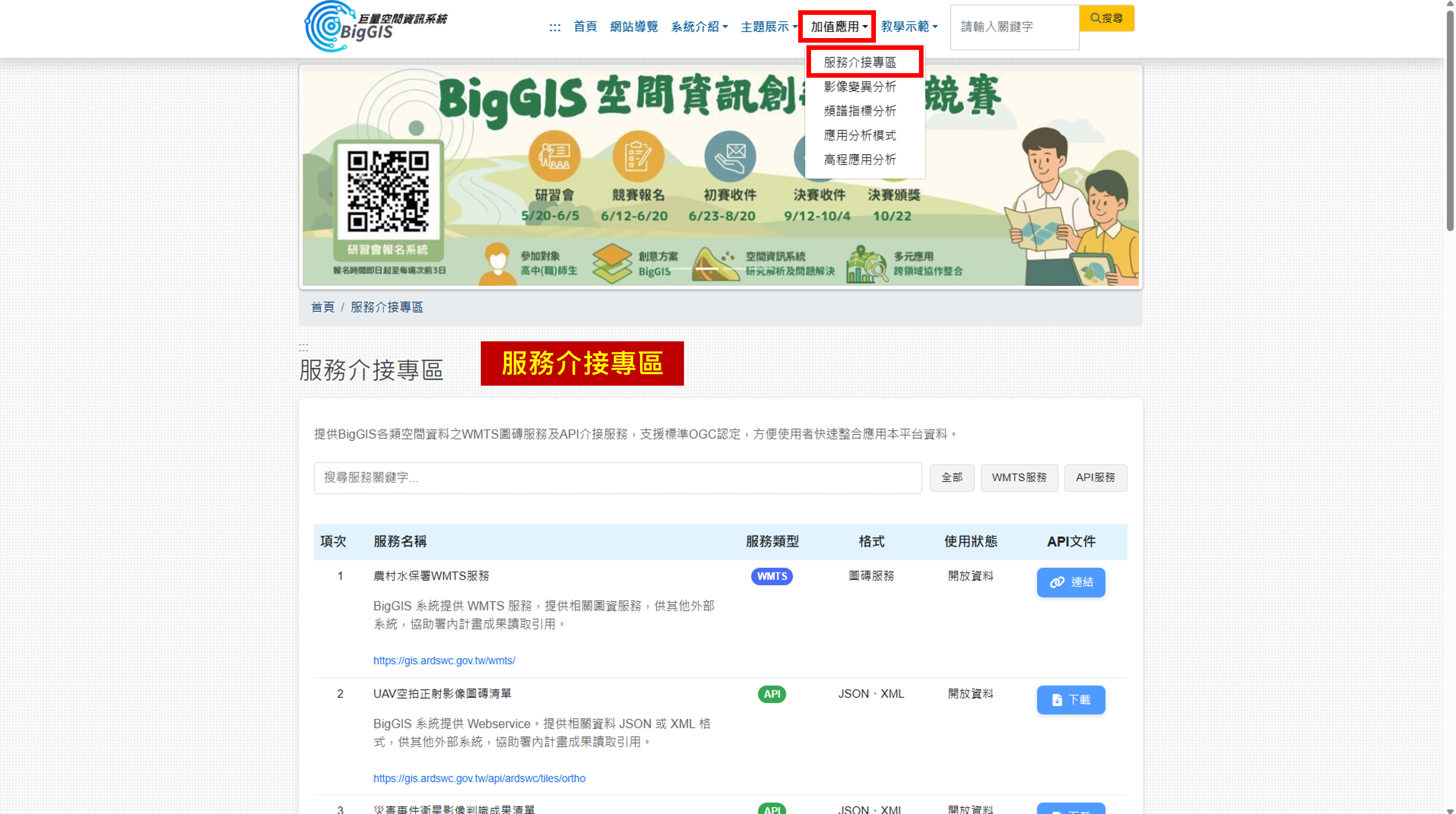 為提升 BigGIS 系統與外部平台間的資料串接能力,入口網站新增「服務介接專區」,使用者可透過入口網站上方「加值應用」選單進入查看。本專區以列表方式清楚呈現可提供介接的圖資與 API 服務內容,包含服務名稱、服務類型、資料格式、使用狀態,以及 API 文件下載連結等資訊,便於外部系統快速比對與引用。