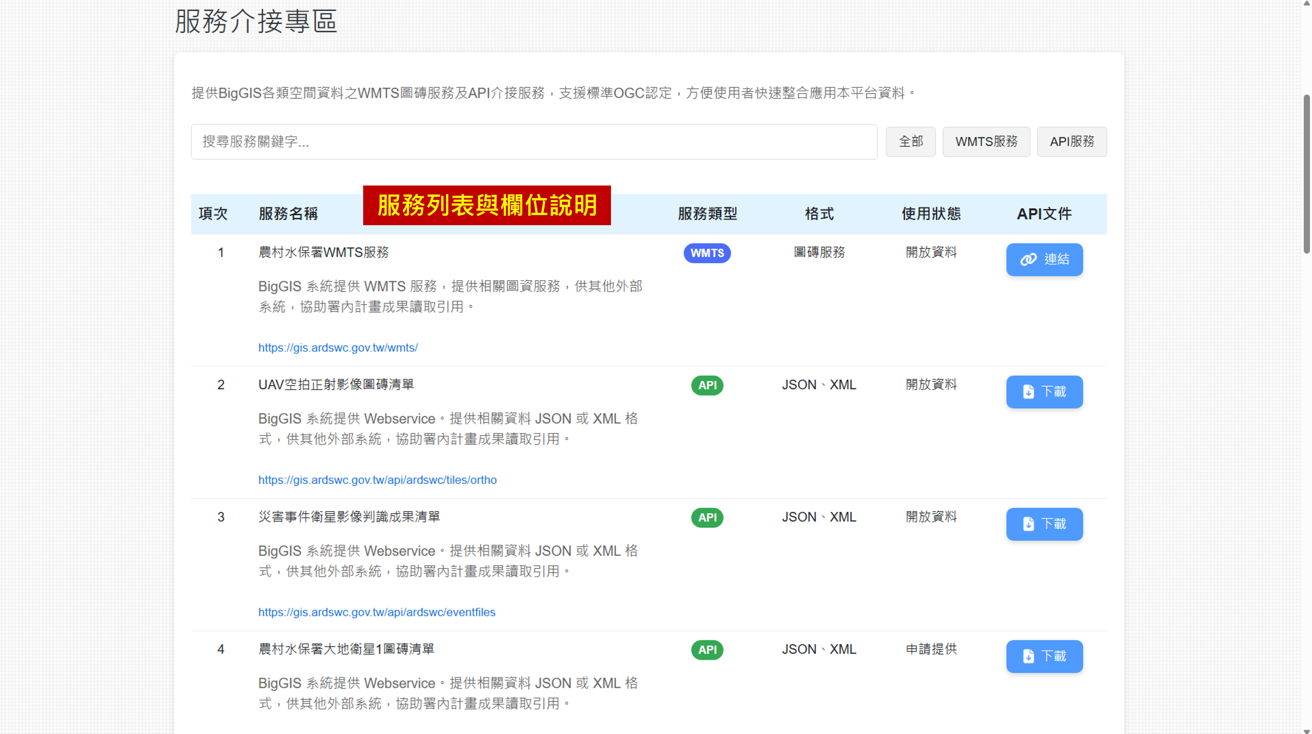 以標籤區分類「WMTS 服務」與「API 服務」,點選即可直接查看該類型下所有可介接服務,提升查詢效率。