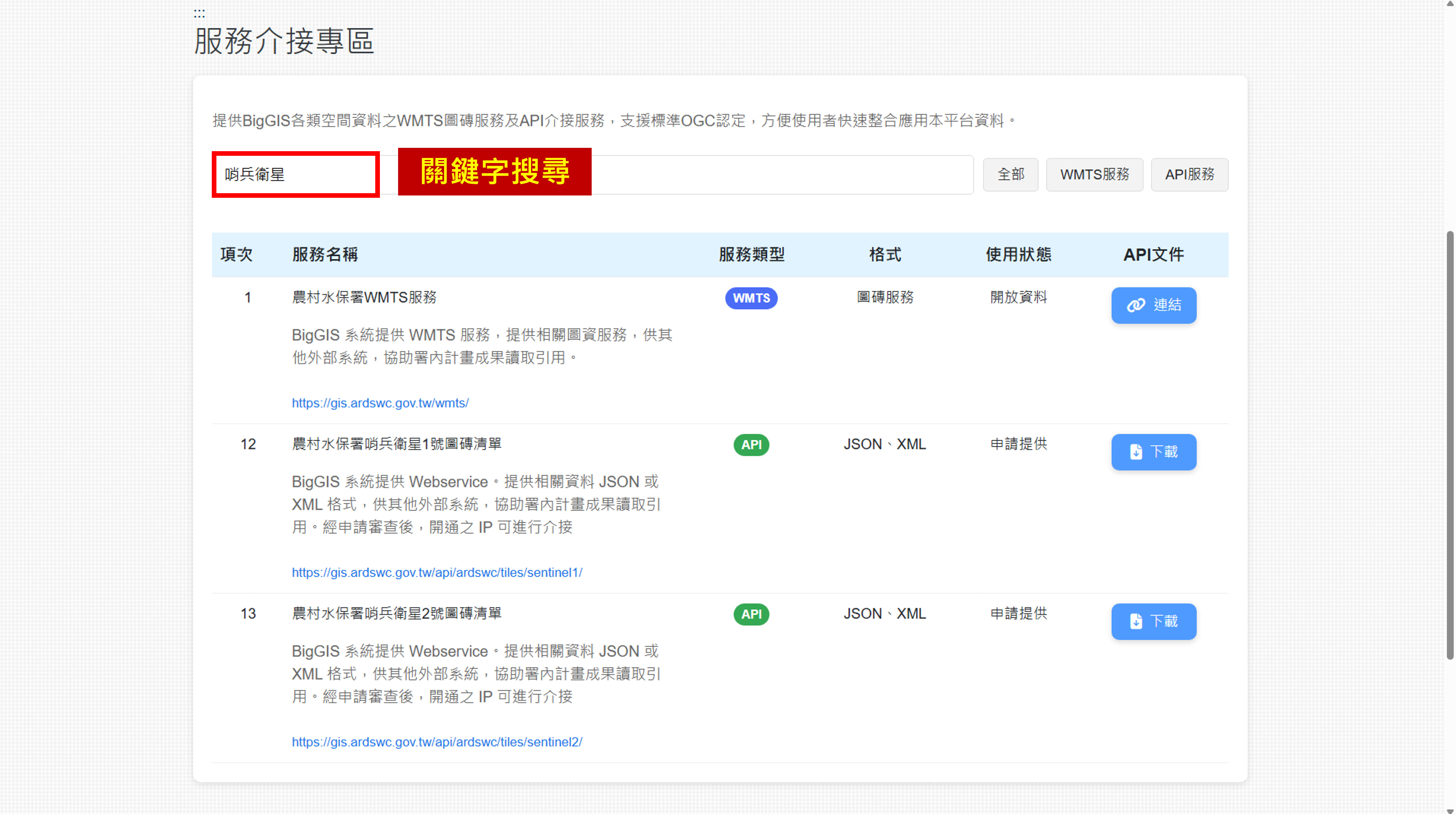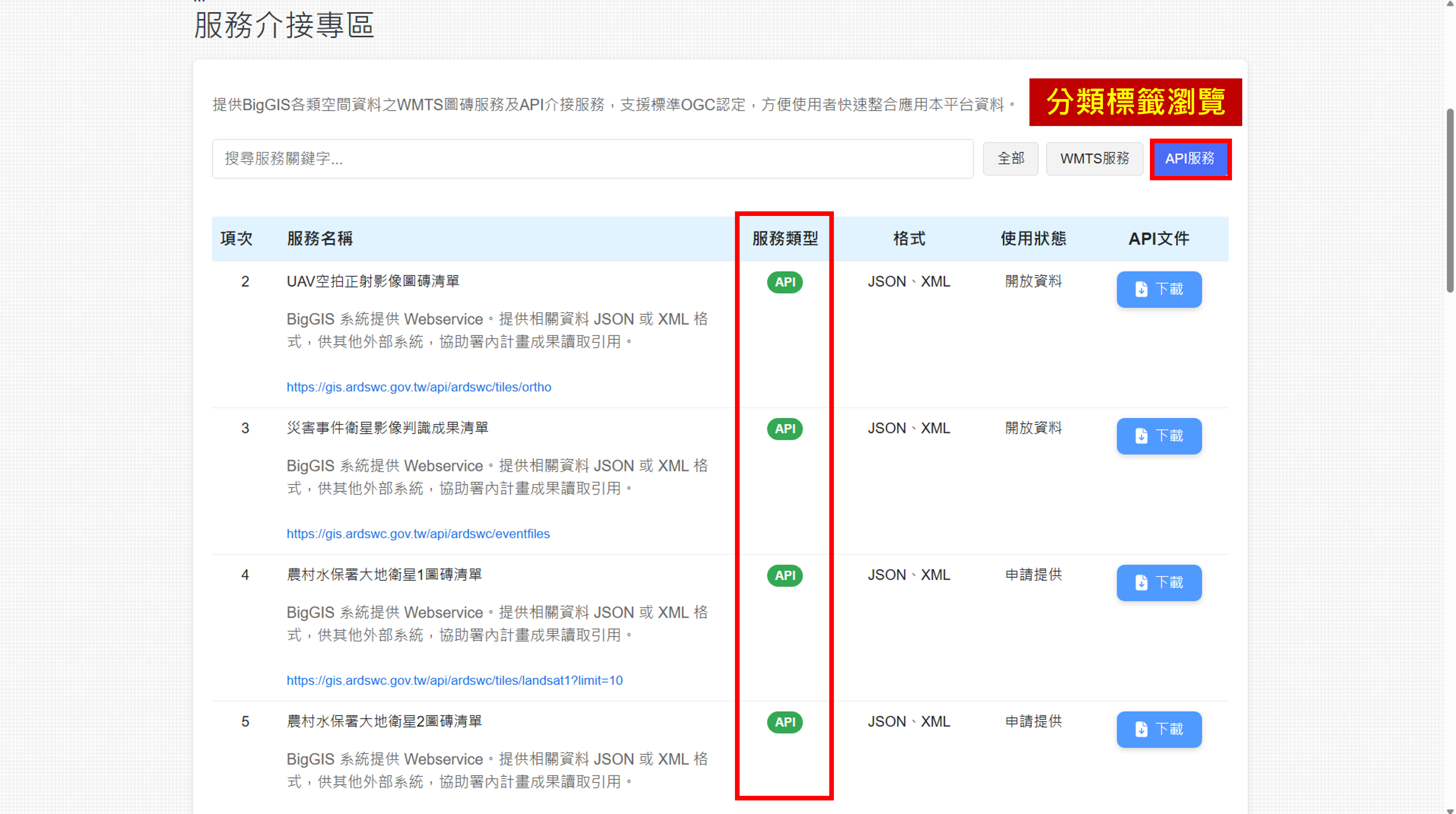 【圖4】點選分類標籤即可顯示同類型服務,如「WMTS 服務」或「API 服務」,方便集中查看並比較不同資料介接模式。