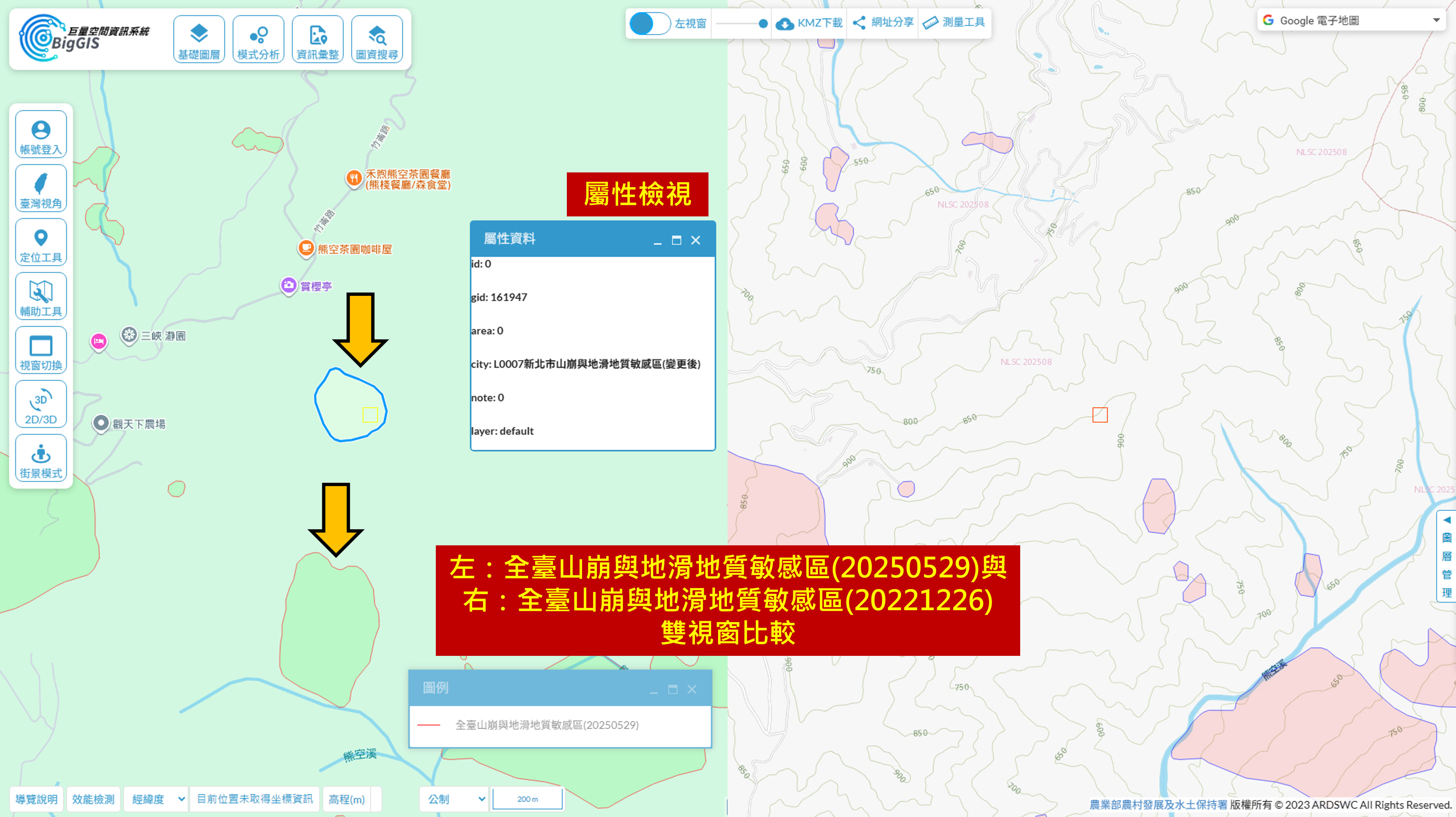 【圖3】兩期圖資以雙視窗比對,新北市三峽區竹崙里鄰近區域也納入2025年全臺山崩與地滑地質敏感區範圍