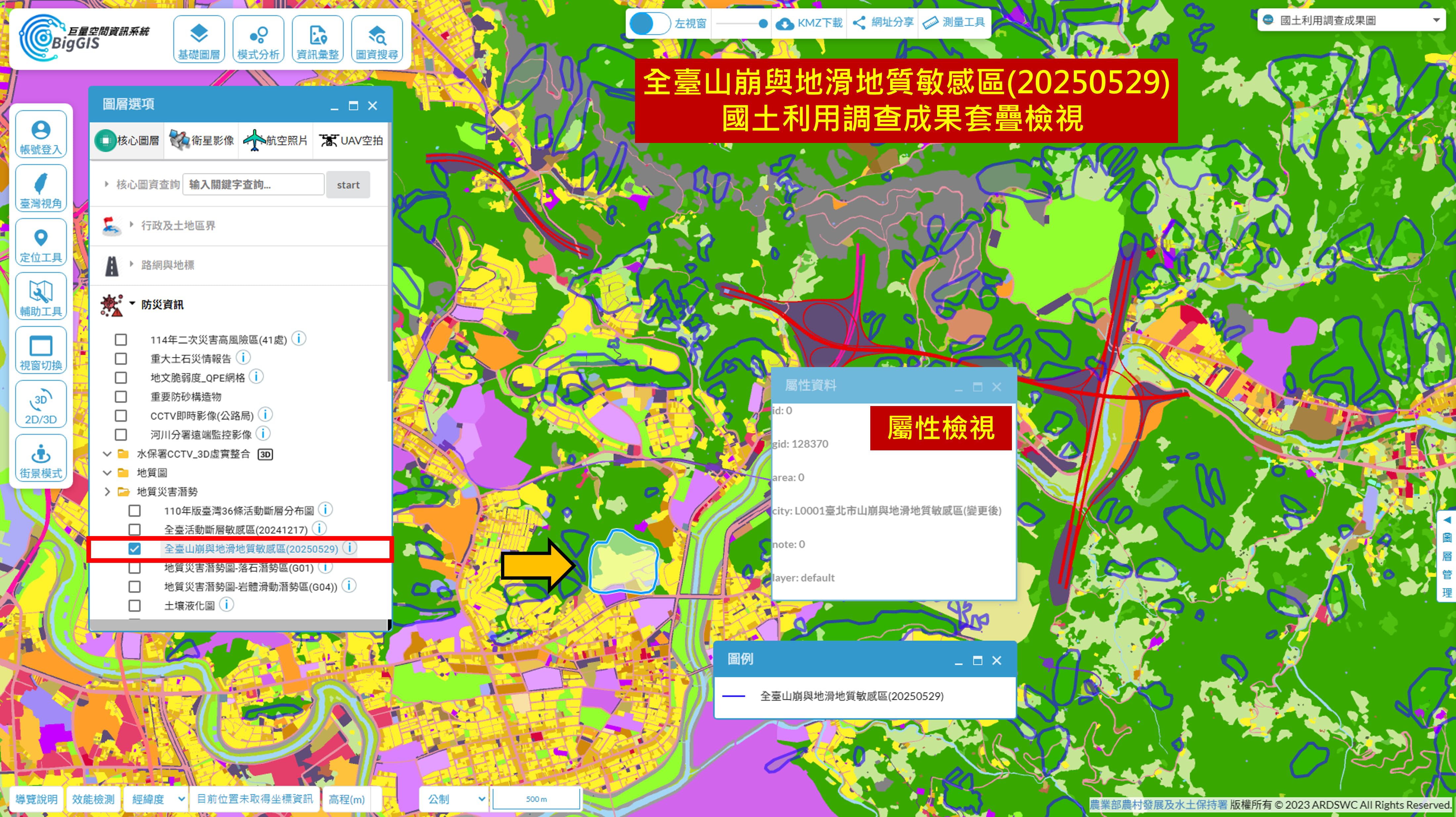 👉使用者可點擊關注位置,並檢視該圖資詳細的屬性資訊。