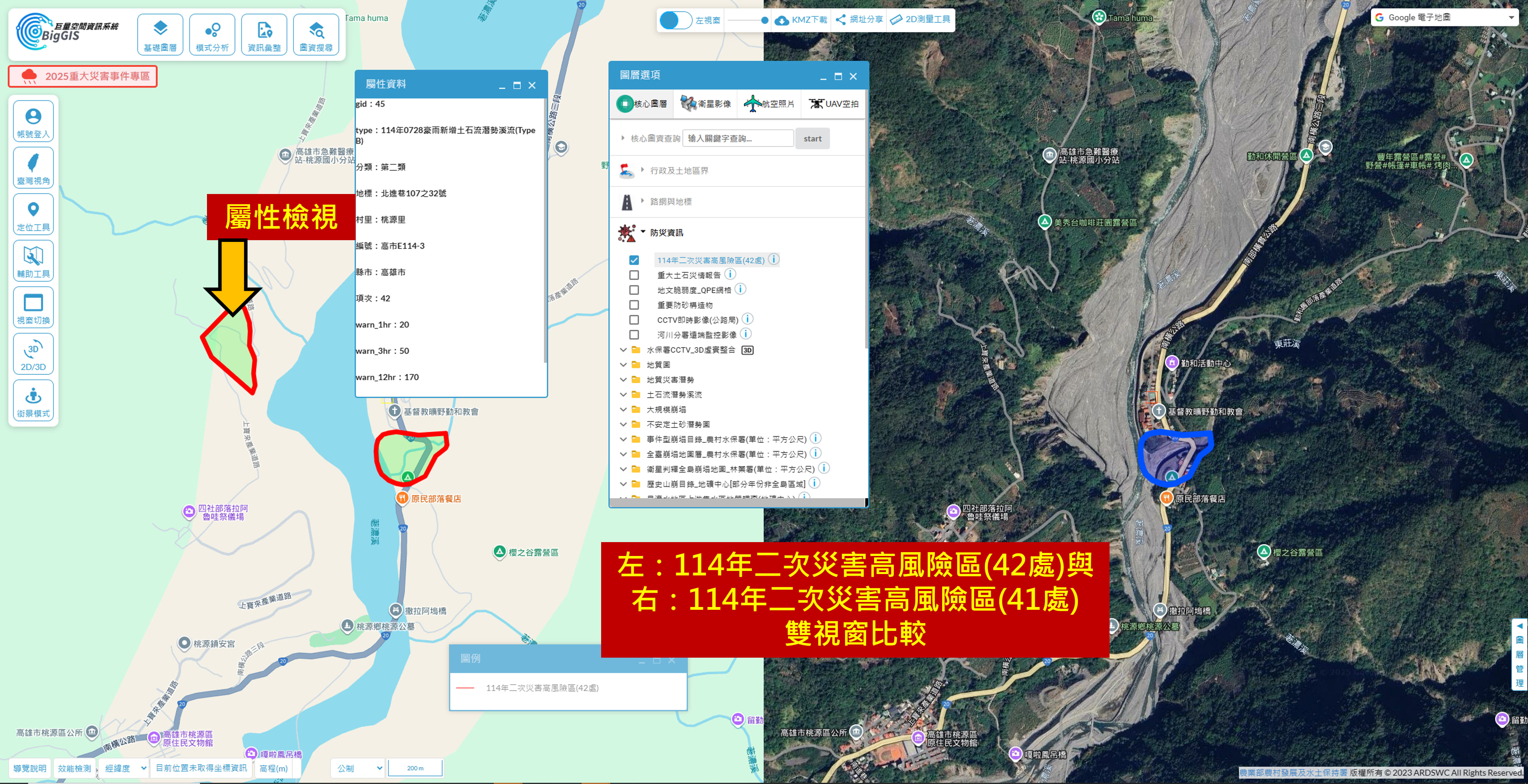 👉兩期圖資以雙視窗比對,例如高雄市桃源區勤和里東莊橋鄰近區域,也納入114年二次災害高風險區範圍圖。