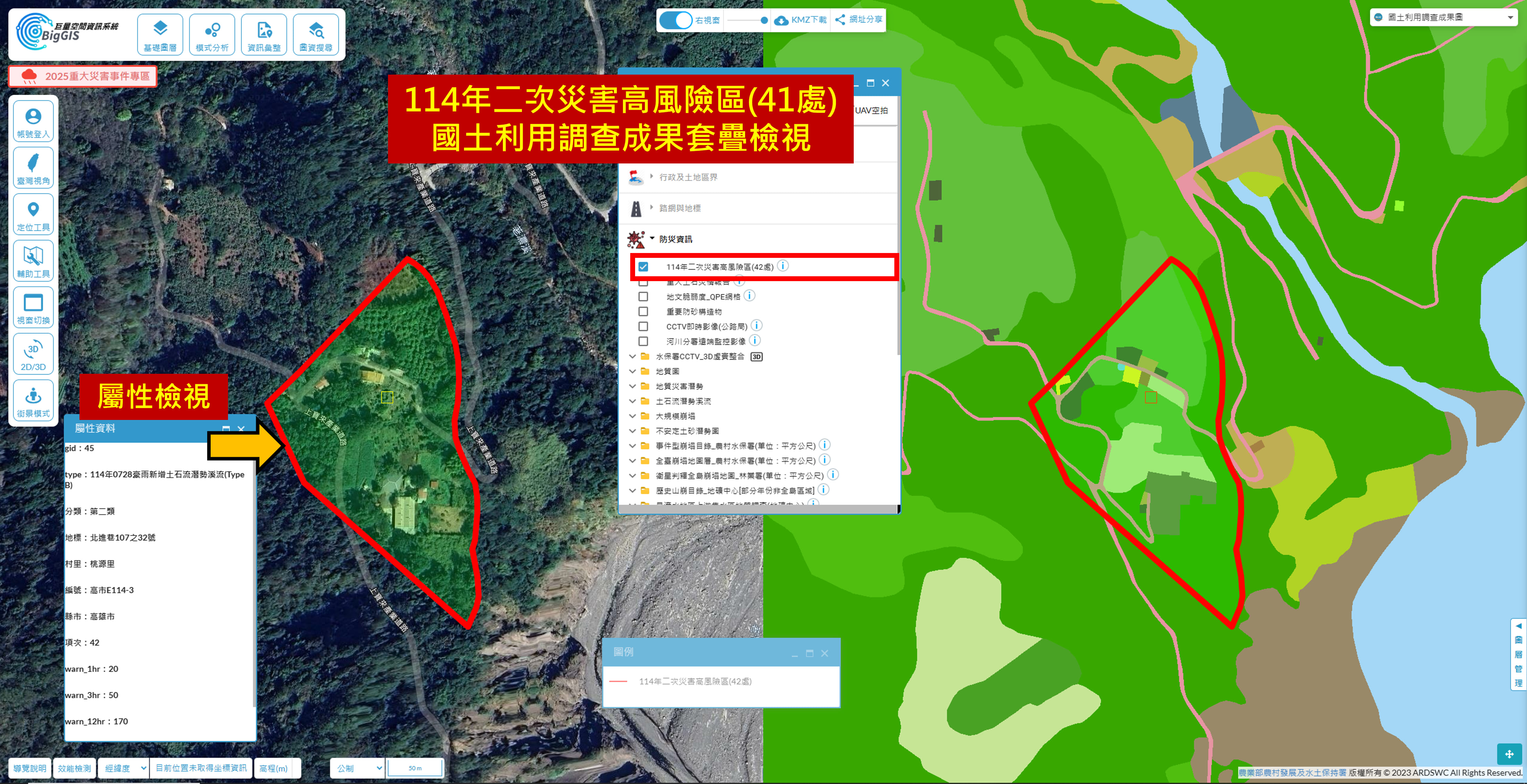 【圖4】114年二次災害高風險區(42處)衛星底圖與國土利用調查成果圖套疊檢視