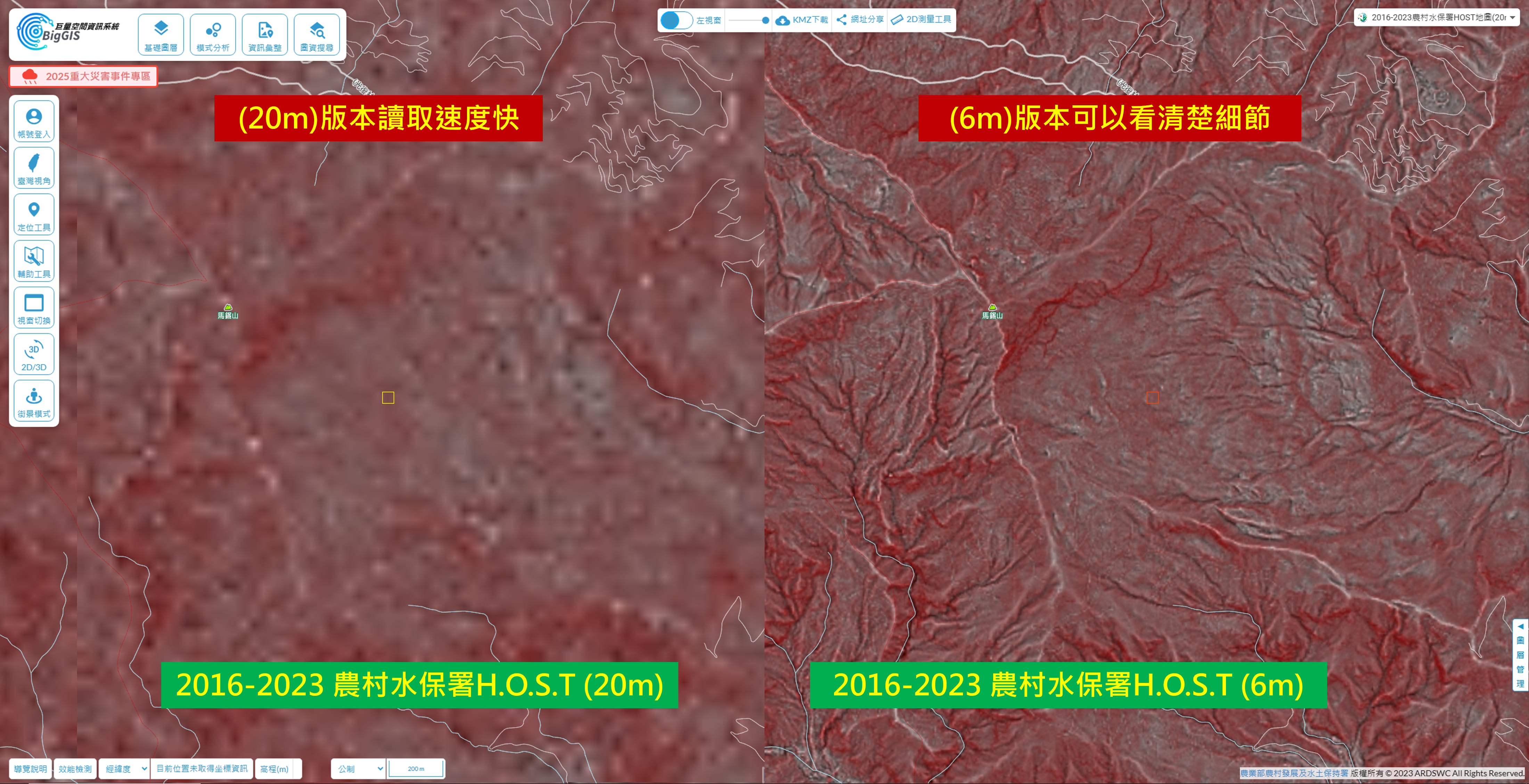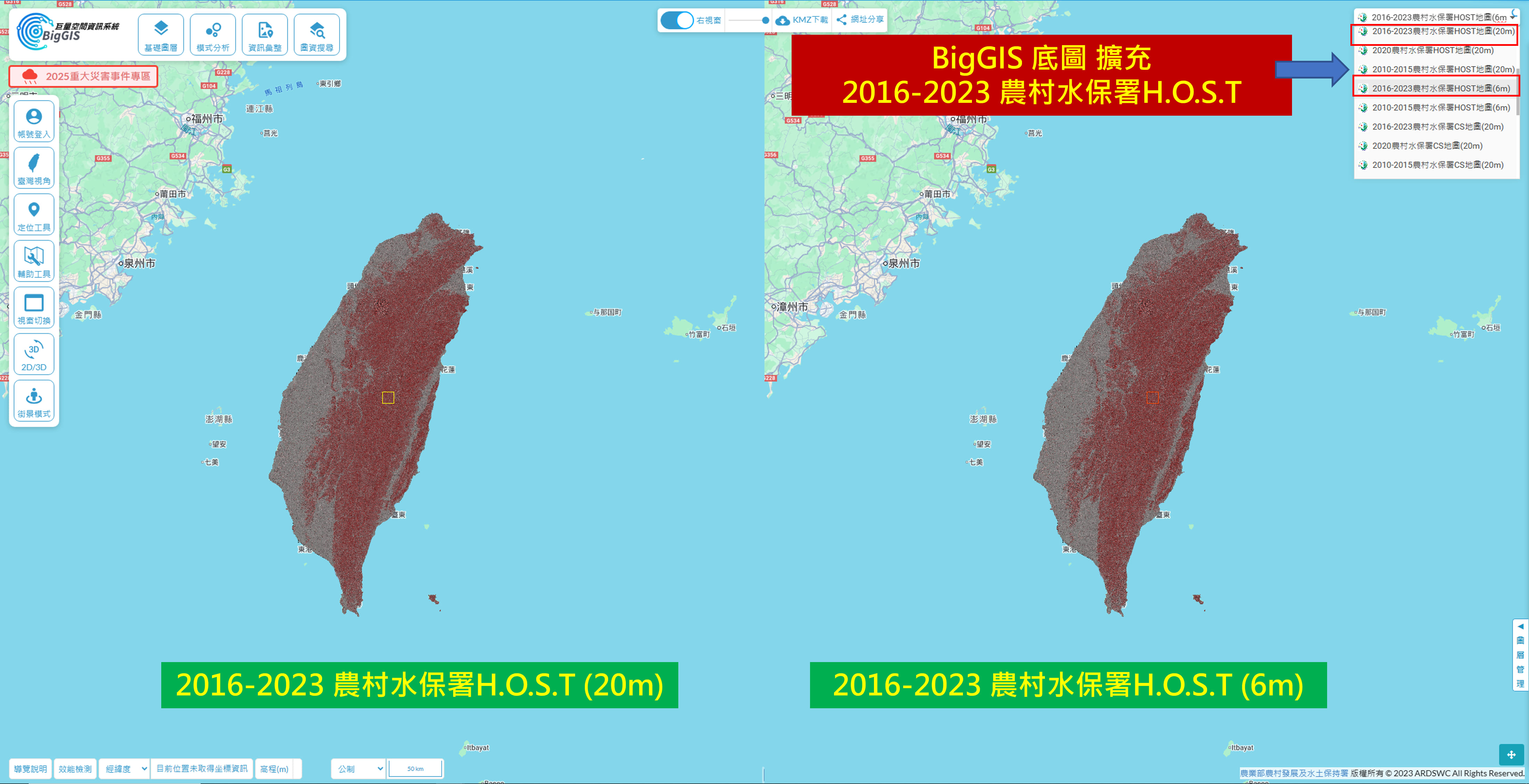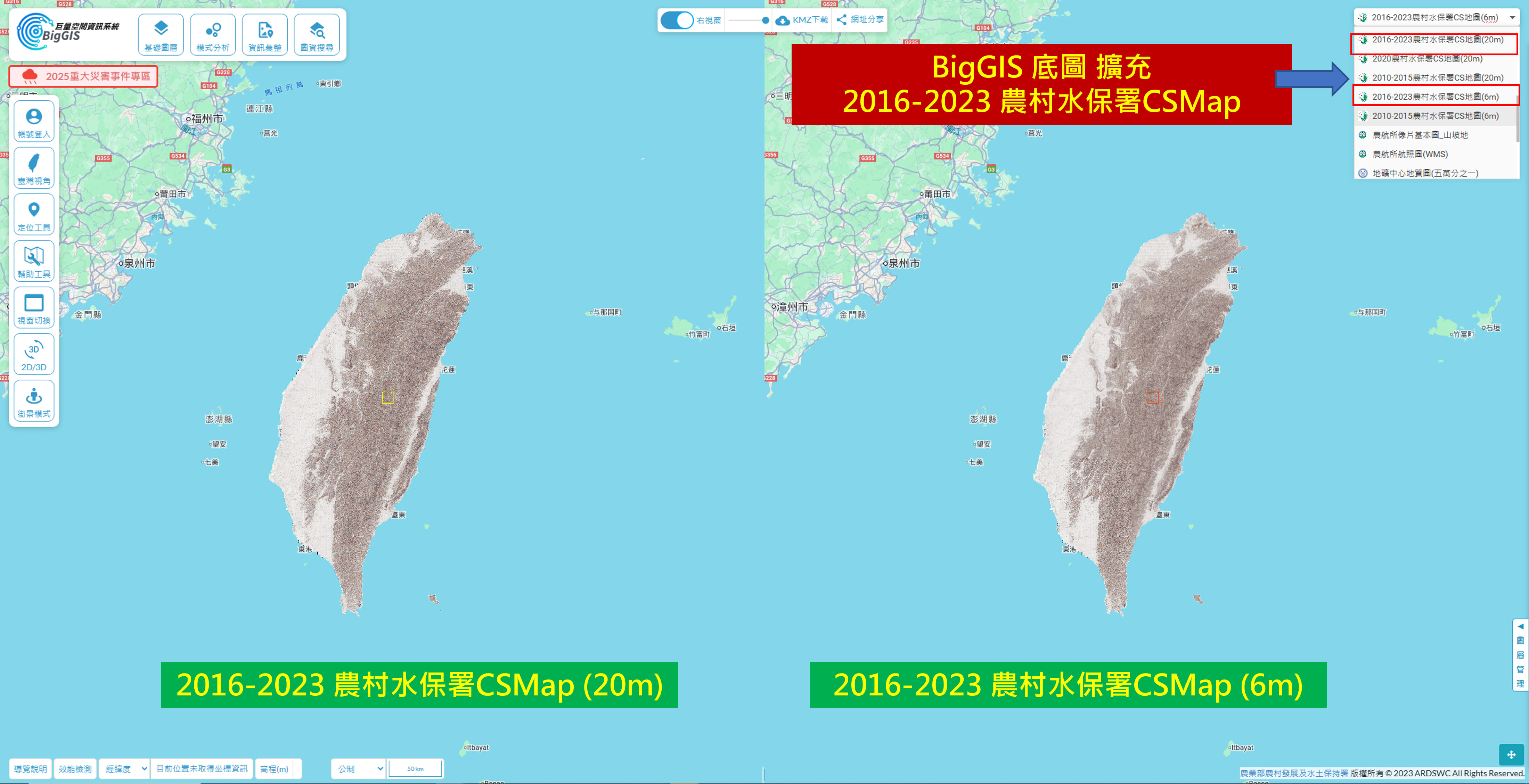 👉 為提升全臺地表地形解析度與地貌變遷比對能力,BigGIS 新增 2016–2023 年最新「農村水保署 H.O.S.T」與「CSMap」資料。