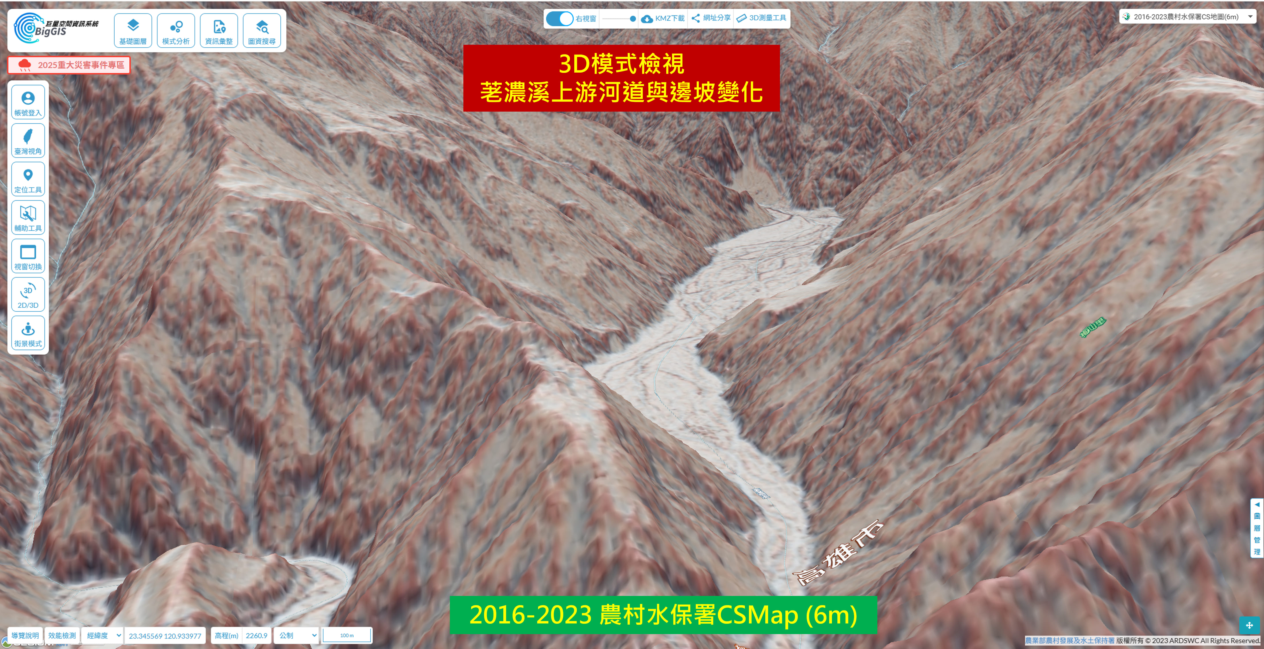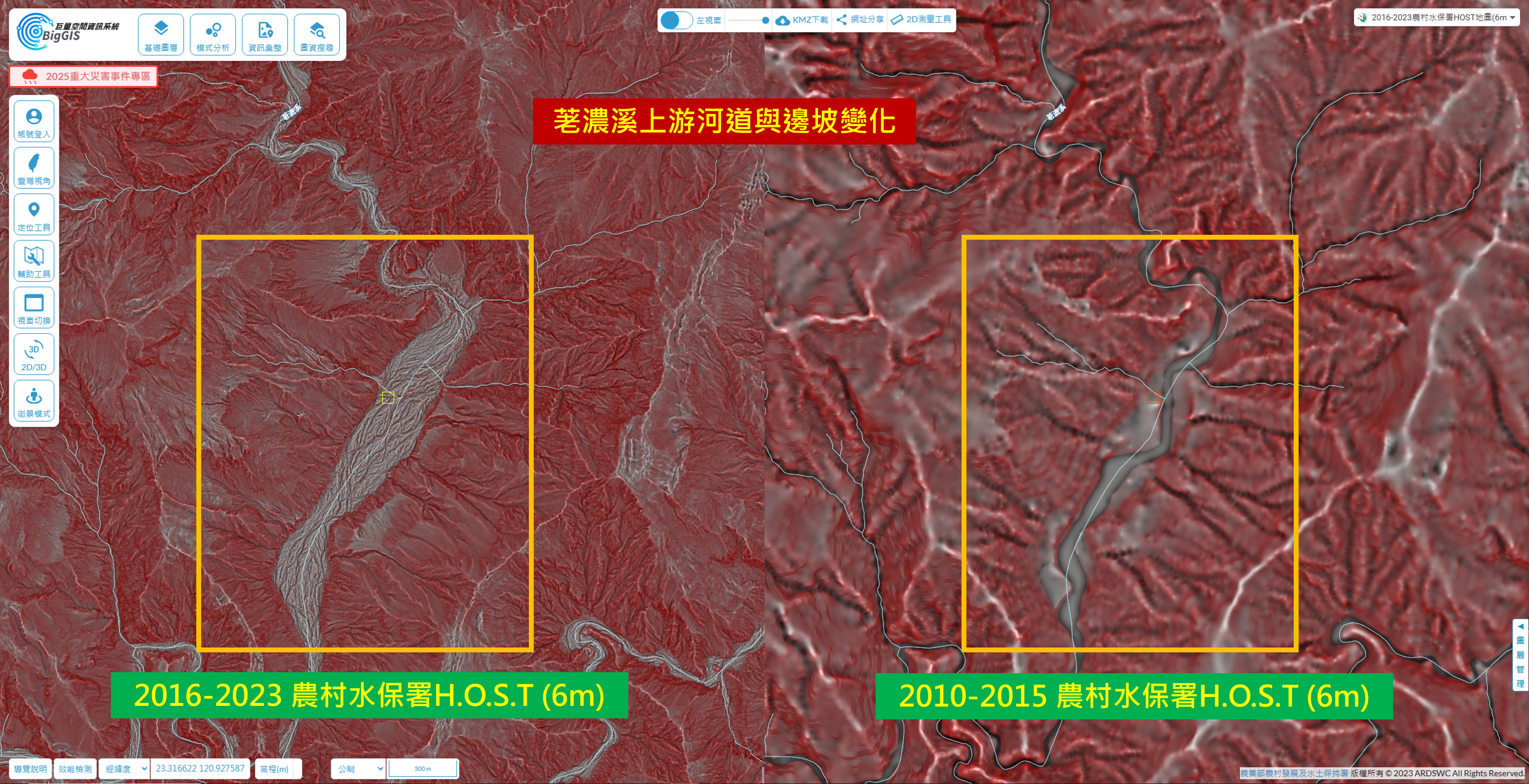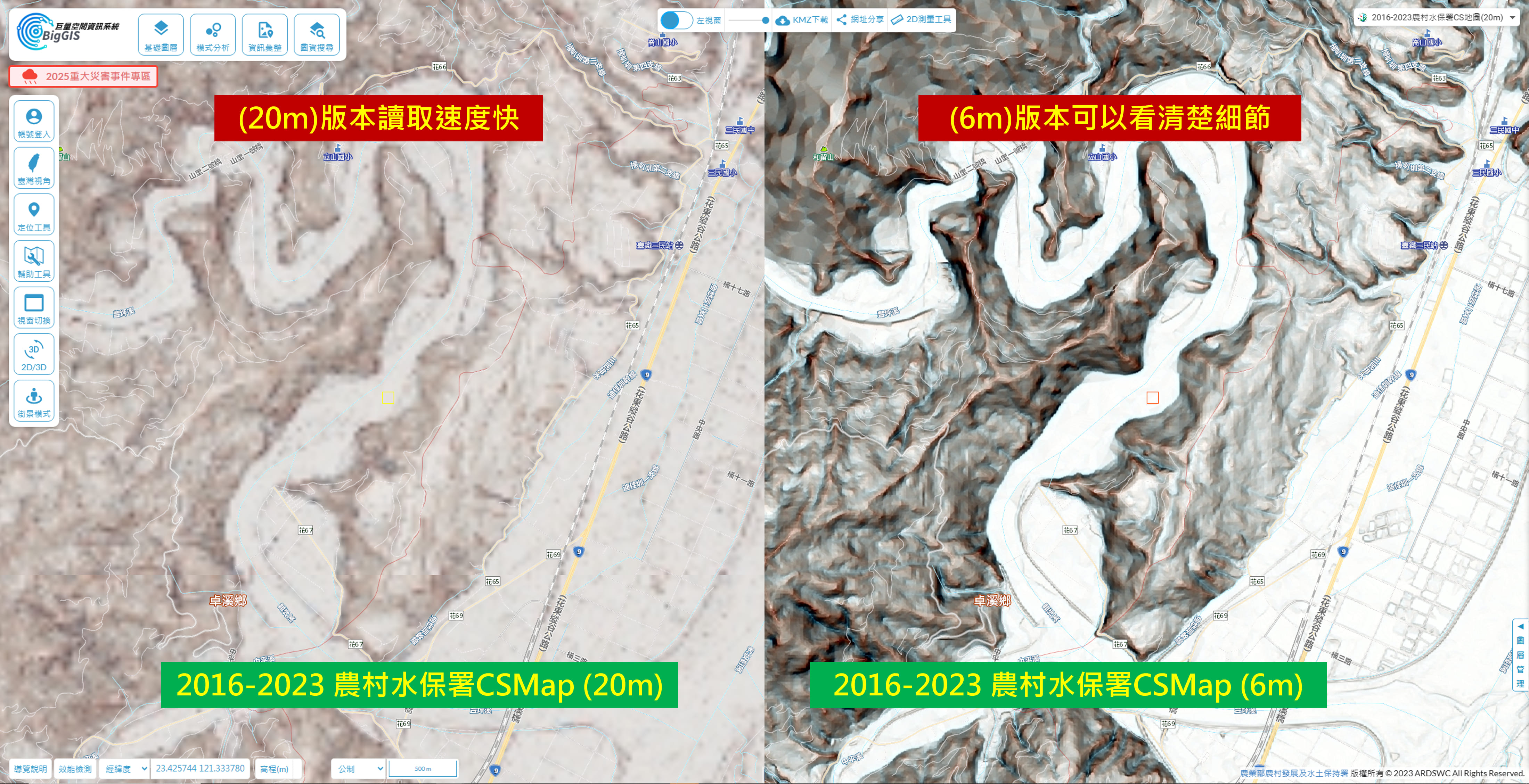 👉 為提升全臺地表地形解析度與地貌變遷比對能力,BigGIS 新增 2016–2023 年最新「農村水保署 H.O.S.T」與「CSMap」資料。