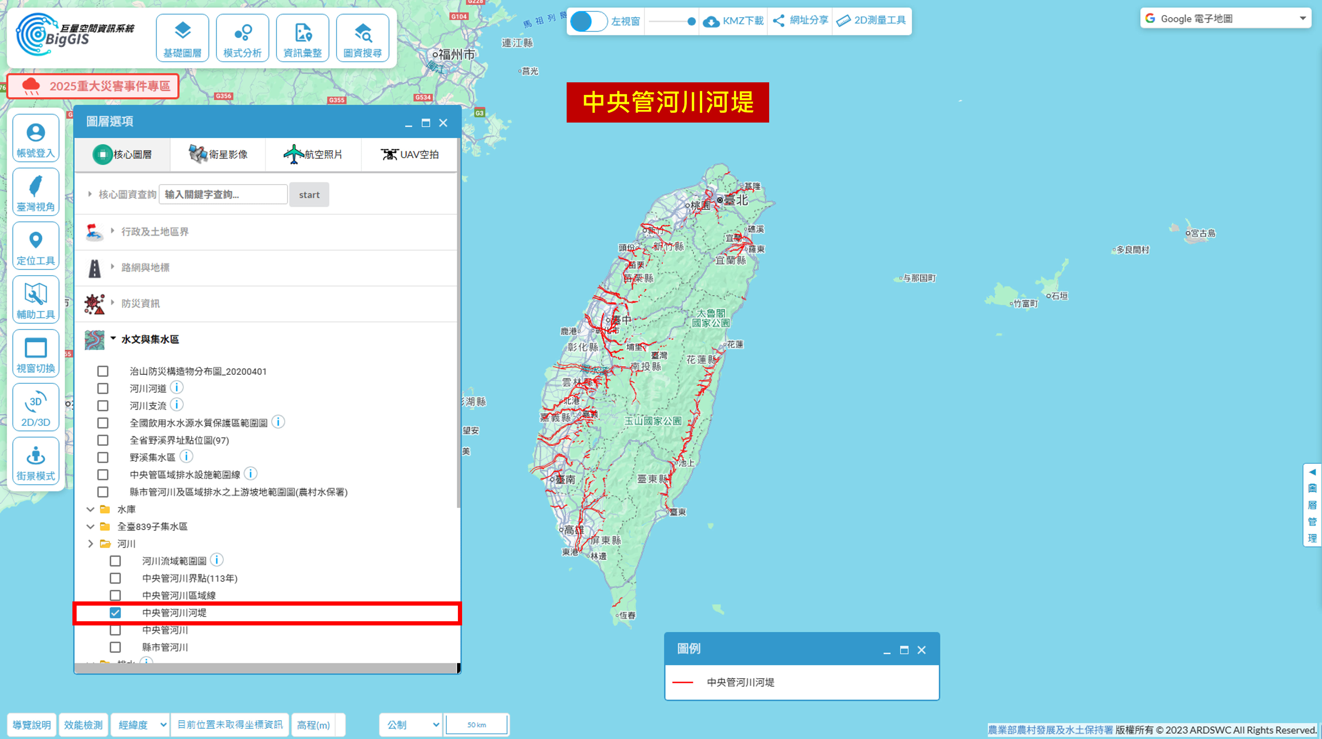 👉新增「中央管河川河堤」圖層,來源為經濟部水利署公告資料,內容包含中央管河川沿線已興建之河堤位置及其分布範圍。