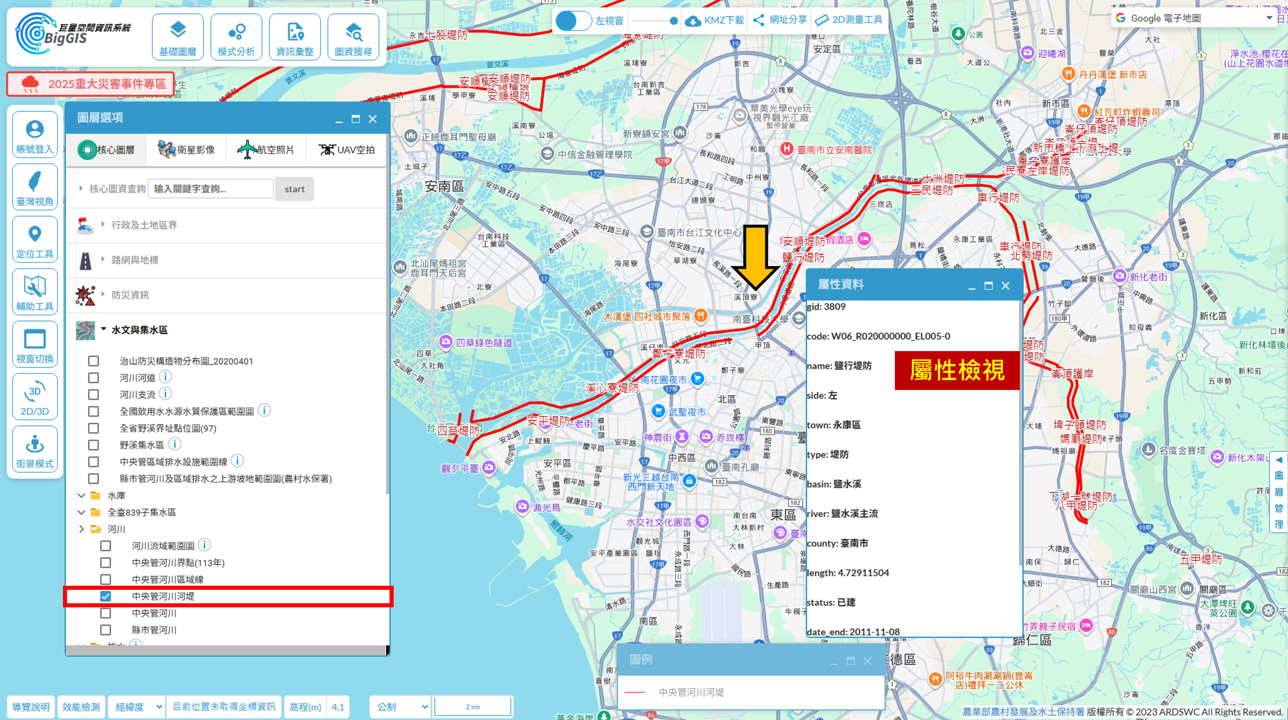 【圖3】中央管河川河堤、中央管河川區域線與中央管河川圖資套疊整合應用
