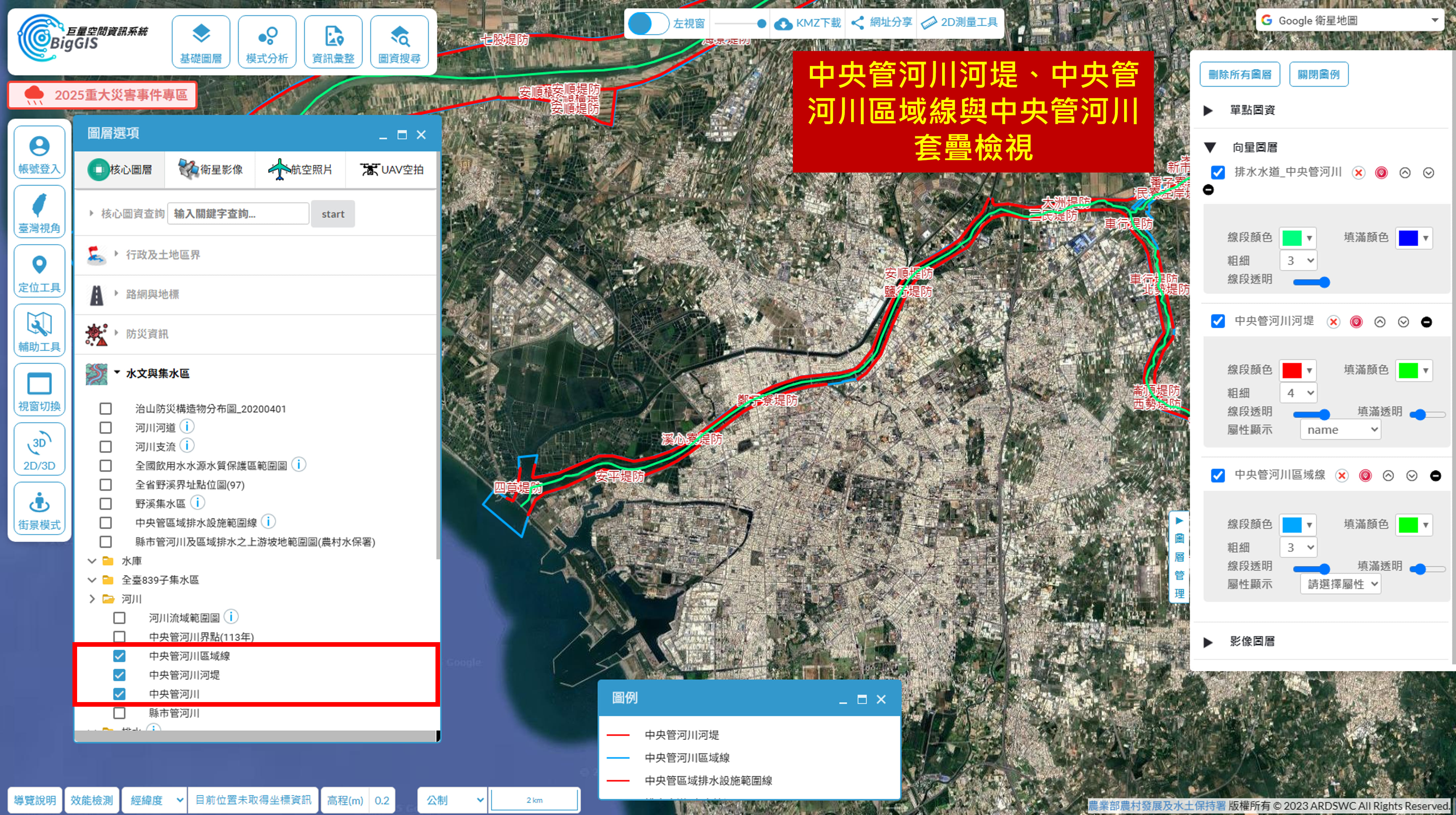 👉中央管河川河堤、中央管河川區域線與中央管河川圖資套疊整合應用: