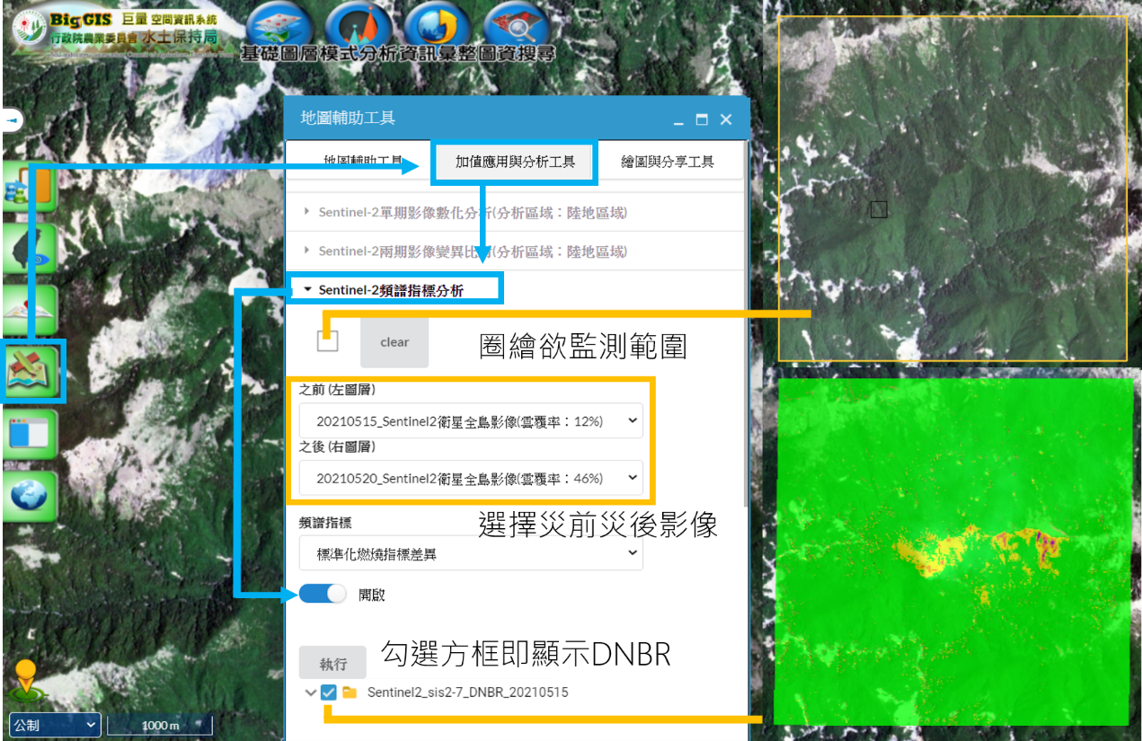 若要使用dNBR來監測這場大火,則可以至BigGIS網站,將地圖輔助工具打開,並在加值應用與分析工具中選擇Sentinel-2頻譜指標分析,就可以在頻譜指標內找到「標準化燃燒指標差異」。玉山大火的發生時間是在5月16日,因此選定這個日期前後的影像後,就可以計算dNBR了。可以看到在20號時,起火點周圍的區域一大部分呈現代表輕微的黃色,甚至有少部分的區域損害嚴重性達到中甚至是高。由於這場大火在20日時還在持續延燒,因此圖5中所呈現的並不是最後的災後影像,而後續衛星拍攝的該地的影像恰好都被雲層所遮擋,若要進一步了解,不妨可以至BigGIS親手操作,試著用dNBR來判釋出這場大火對周遭林地的影響吧,如圖5所示。
