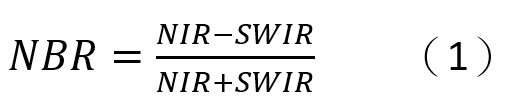 圖3是健康植物與燃燒餘燼在不同波段的反射訊號,其中NBR利用了健康植物與燃燒後的灰燼在近紅外線和短波紅外線的反射訊號強度差異,達到快速判釋災情和起火地點的效果,NBR的定義如(1)式所示,其中NIR為近紅外線反射強度,SWIR為短波紅外線反射強度。
