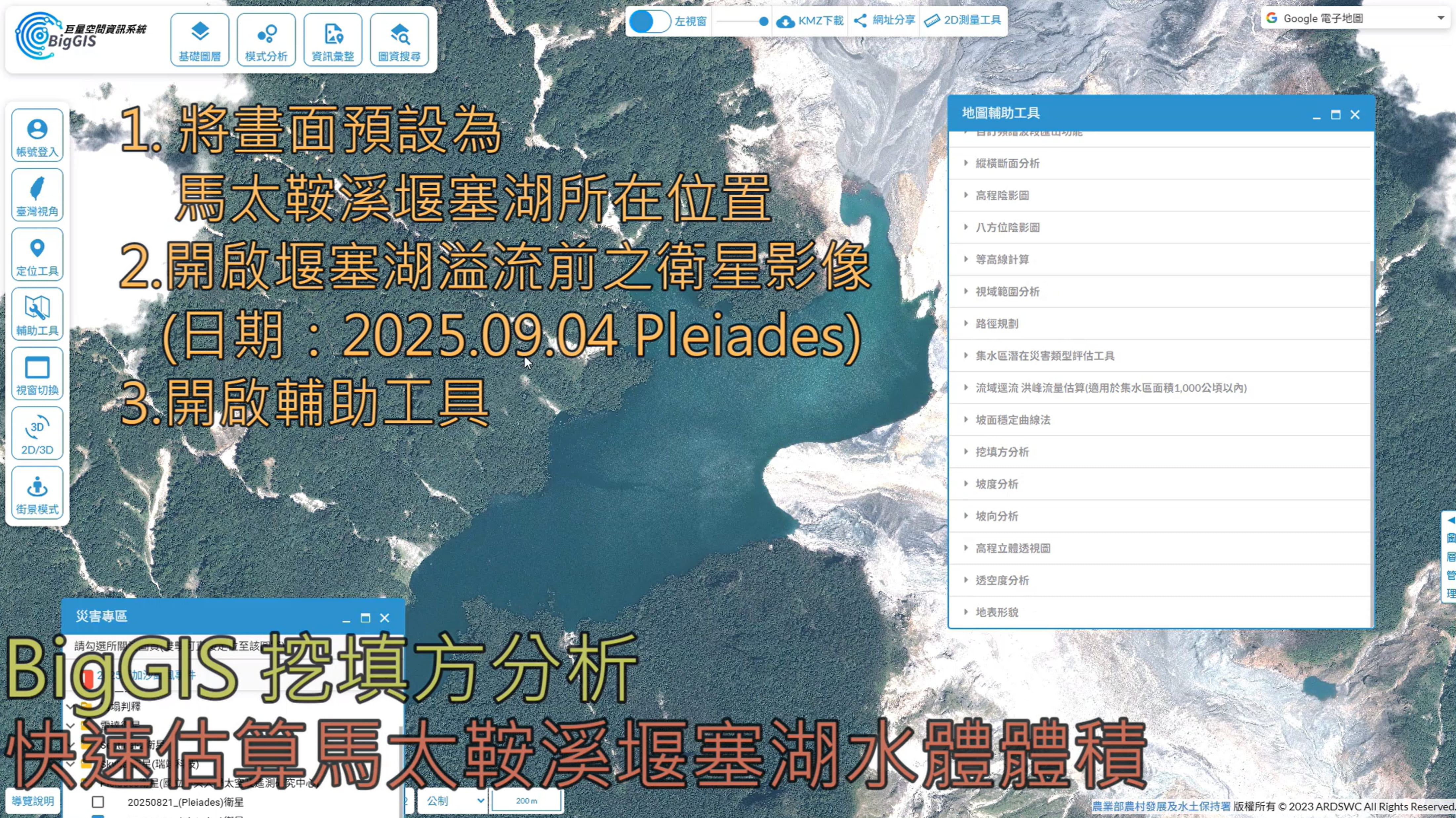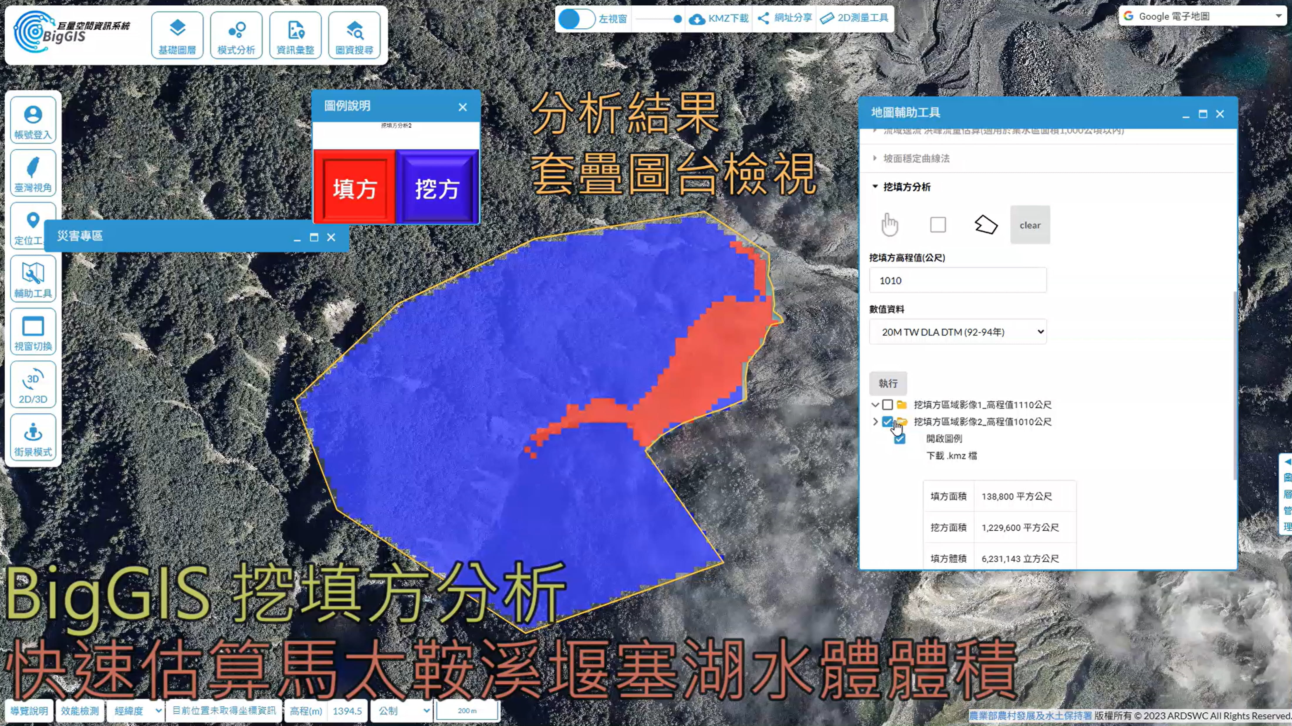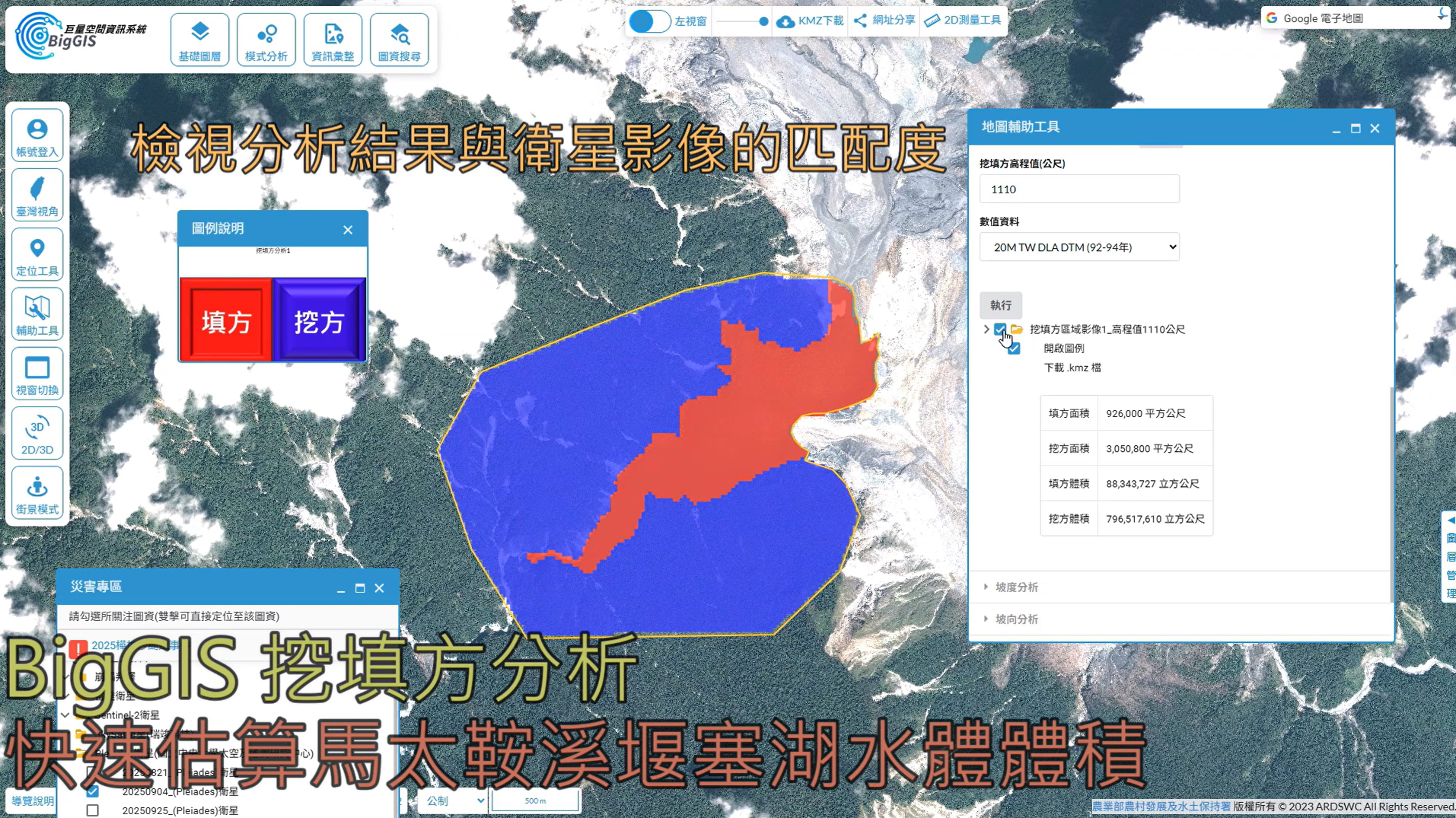 - 利用 BigGIS 的「挖填方分析」功能,快速估算堰塞湖水體體積。
